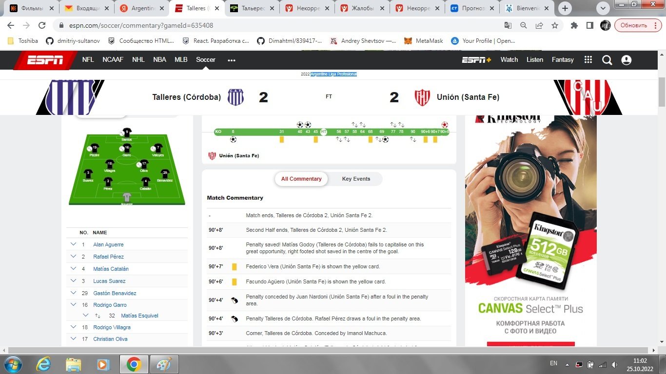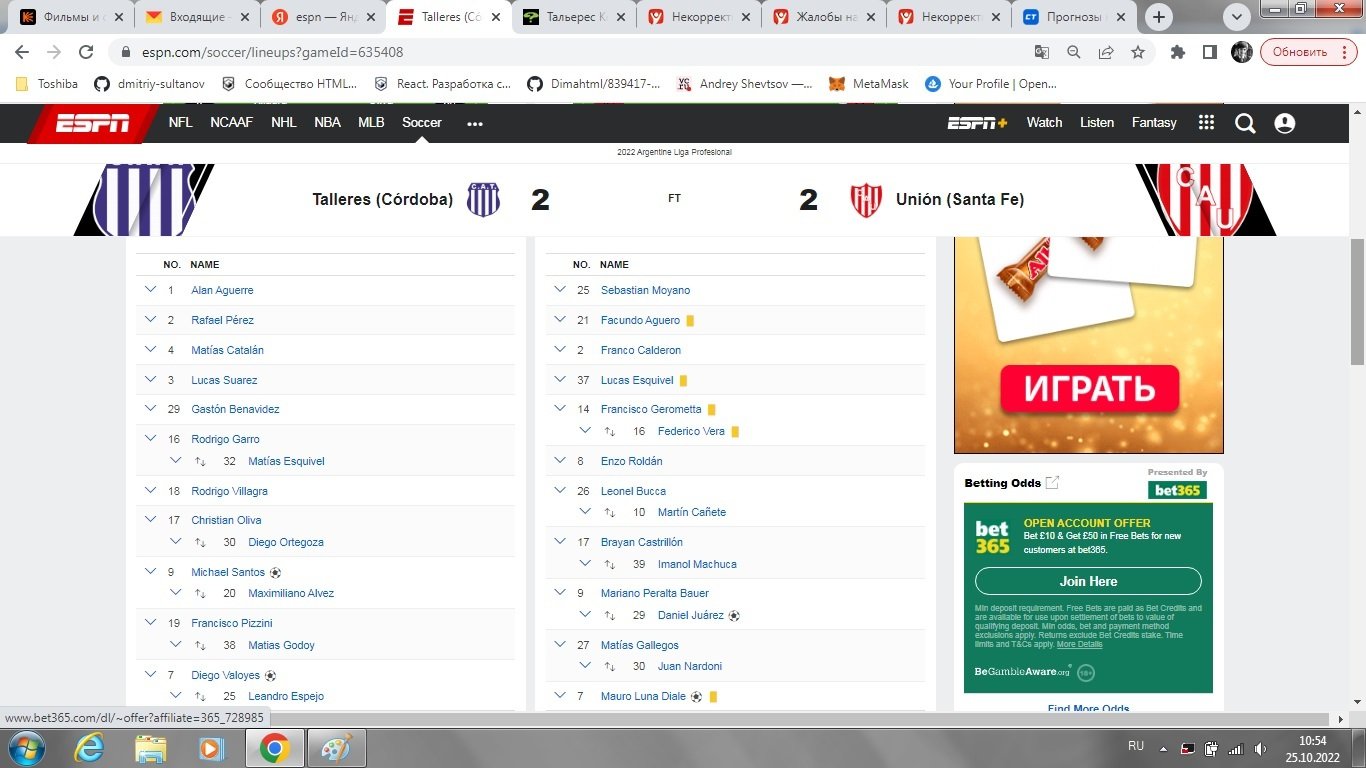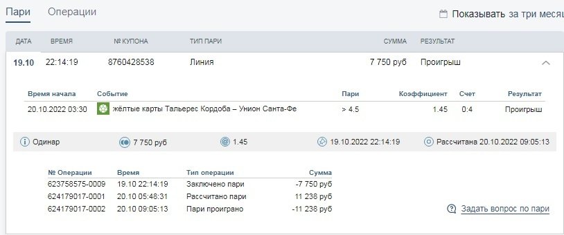 Добрый день. мною была сделана ставка на ЖК ТБ 4.5 в матче Тальерес Кордоба - Унион Санта-Фе. Матч завершился со счетом 0-5 по желтым карточкам и ставка была рассчитана как выигрыш, но через какое-то время произошел перерасчет и счет в БК поменялся на 0-4. Хотя по всем источникам счет не поменялся, в том числе на сайте лиги, espn и whoscored. Карточки были показаны на 31, 45, 68, 96 и 97 минутах. Затянулась длительна переписка с администрацией БК, они ссылаются на пункт правил "4.4 Если первоначальный результат завершенного события позднее отменен (изменен) по каким-либо причинам, пари рассчитывается в соответствие с первоначальным" Но тут ситуация обратная, изначально БК рассчитало пари как выигрыш, а в дальнейшем произвели перерасчет. Но статистика в официальных источниках указана верно. Я лично смотрел трансляцию, отмененных карточек в матче не было, так же не было вторых желтых карточек, которые привели к красной.