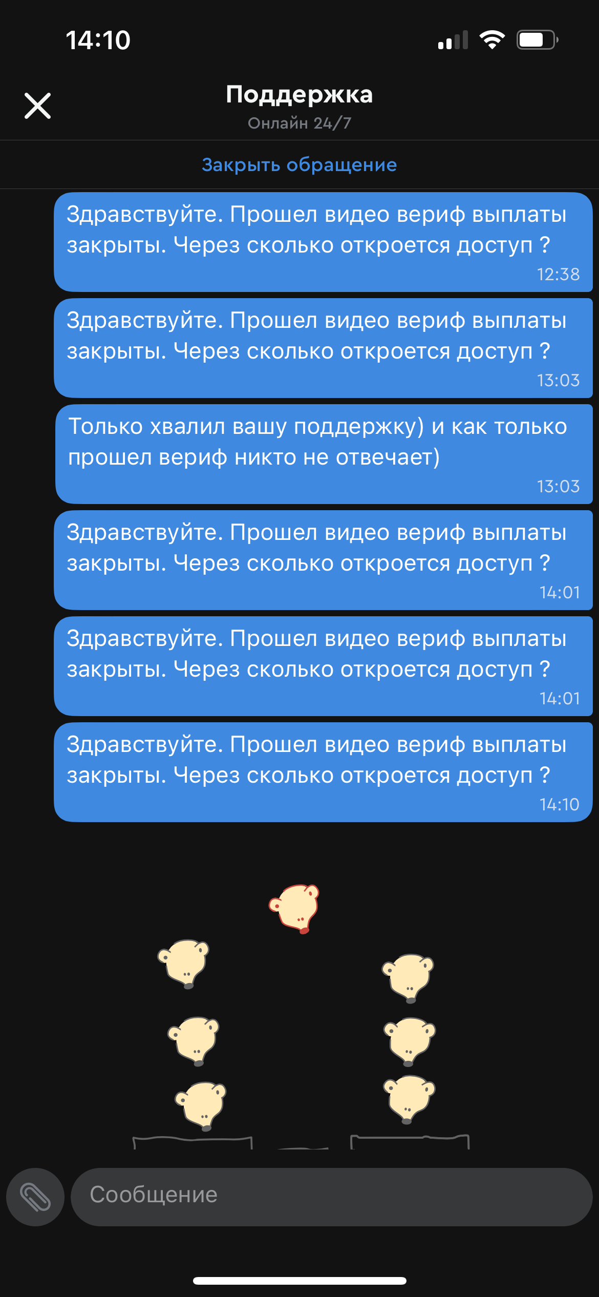 Ставил на мма,кулачку,баскеты. Выиграл суммарно тыщ 20 рублей и запросили видео верификацию. Прошел верификацию. Сказали ,что откроют доступ в течение 5 минут. Разумеется , никто домтуп не открыл и тех. Поддержка не отвечает. Звонил на горячую линию ,ждал 10 минут. Когда сказали я первый в очереди ,через 10 сек ответили все операторы заняты, звони позже. Понятно,что брать трубки они тоже не будут. Пока по рейтингу моему винлайн пробивает дно, но хотя бы отвечают и берут трубки. Олимбет двигается не в том направлении…ну ,надеюсь, легалбет сможет повлиять на сие чудо под названием Олимпбет. Помогите,пожалуйста,разобраться с очередной «честной» БК Олимпбет. Мой счет номер 98753631.