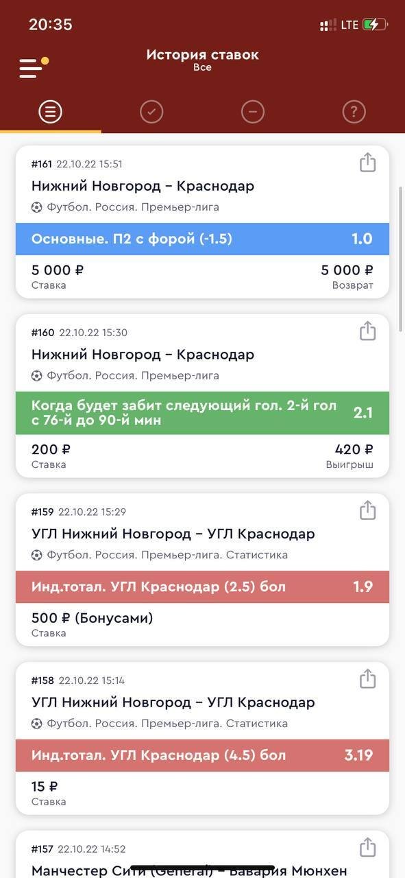 Здравствуйте! Делал ставку на матч Нижний Новгород - Краснодар. на П2 с форой -1.5 в матче за коэффициент 8. Сначала всё было хорошо, порадовался выигрышу, потом спустя час-два, когда поставил денежку на вывод приходит возврат. Ставку заключил приблизительно на 94 минуте матча. Ставка сыграла на 96 минуте, но была рассчитана по коэффициенту 1 ссылаясь на пункт правил В. Поддержка разводит руками, отвечает шаблонами. Прошу рассчитать по коэффициенту по которому я заключал пари или по среднерыночному коэффициенту. Заранее благодарен администрации Олимпа и Legalbet, надеюсь на честное и справедливое решение.