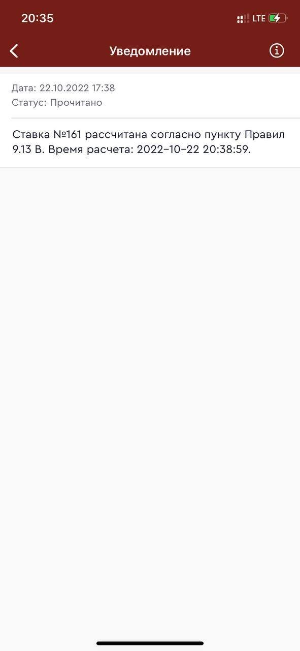 По информации от букмекера, ставка рассчитана возвратом, согласно п.п. 9.13, по причине возникновения зависшей линии. Арбитраж Легалбет не видит значимой некорректности в принятой котировке. В расчете ставки по изначально принятому коэффициенту букмекером отказано. Статус жалобы - не решено.