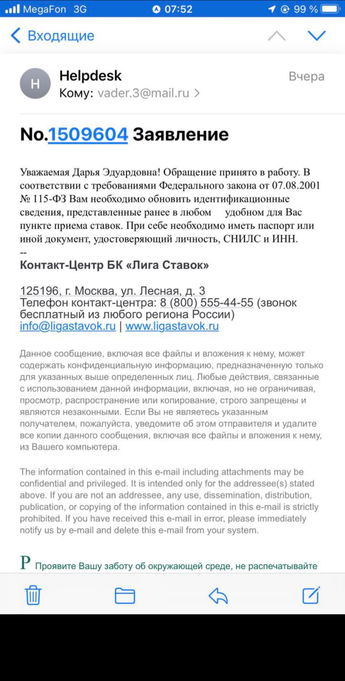 Зарегистрировалась 3 дня назад, наиграла около 2000 рублец, попросили в мобильном приложении загрузить документы чтобы вывести деньги, в итоге после того, как я загрузила документы мне был закрыт доступ к личному кабинету и написано: «ваш счёт заблокирован», позвонив на горячую линию мне сказали, что надо написать заявление, а какое заявление и гле образец найти не сказали, в моем субъекте РФ нет филиалов у вас, в итоге мне или ехать далеко надо или гле найти образец и можно ли его скинуть по почте?пояему так сложно? И за что счёт заблокировали?выиграла копейки, документы выслала, через госуслуги готова подтвердить свою личность, а вы специально создаёте проблемы новым клиентам