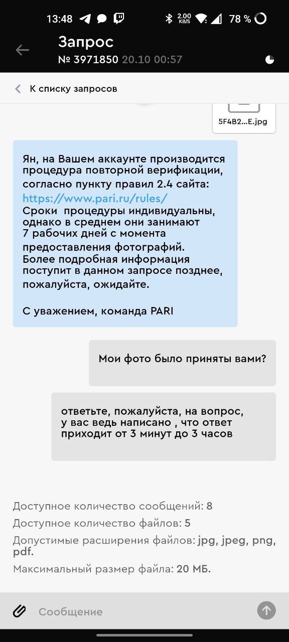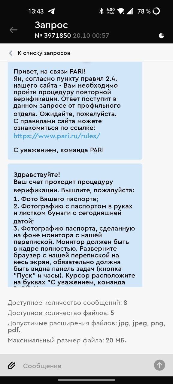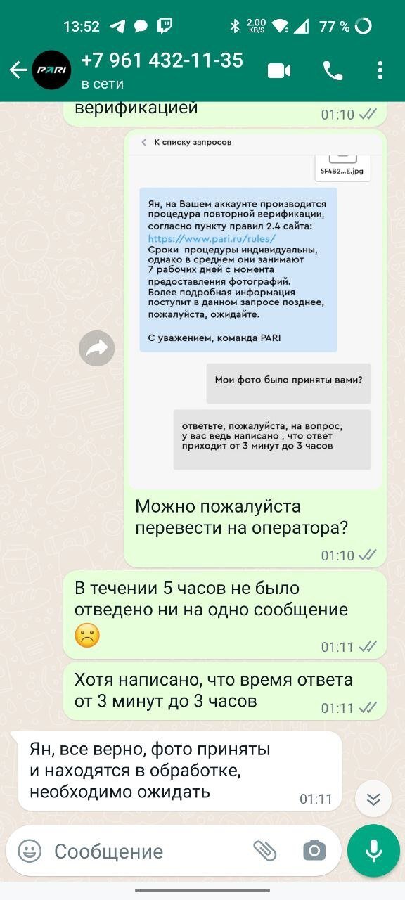 Здравствуйте! Меня зовут Ян, мой игровой номер счёта-17342855, в прошедшую среду, 19 октября около по мск по итогу нескольких ставок (их скриншот прикрепить не смогу, так как они у меня пропали из истории пари) с депозита в 25 тысяч рублей на моём аккаунте получилось 98800р, я решил вывести 40 тысяч из них , и всегда на протяжении всего полугода, что я пользуюсь конторой, мне моментально выводили деньги, но на этот раз пришлось ждать, ждал около часа, после чего я решил отменить вывод и кинуть 20 тысяч на вывод (решил уменшить сумму, может так выведут быстро), но естественно это не помогло, я решил написать в онлайн поддержку в whatsapp, где решил уточнить почему я впервые так долго жду статус "ожидание подтверждения со стороны букмекера" на что я получил в ответ сообщение о том, что мне придётся пройти видеоверификацию (см. скриншот номер 1) которую, к слову, я уже проходил ранее , (искренне не понимаю, зачем они делают второй раз ее, но разве у меня есть выбор?) Я говорю "Хорошо, давайте" и указал свой номер, к которому привязан мой Whatsapp (см. скриншот номер 2), спустя 15 минут я решил уточнить когда поступит звонок, на что в ответ получил сообщение о том, что моя выплата готова, я это уже и сам увидел по уведомлениям банка еще до их ответа и сразу же поставил на вывод всю оставшуюся сумму ( рублей), потому, что все эти движения мне уже начинали не нравится, я начал очень сильно переживать, на их сообщение о том, что мой вывод уже одобрен я им написал, "Да, вижу заказал ещё один вывод, видеоверификация больше не нужна?" (см. скрин номер 2) На что они уже отвечают, что просят меня пройти повторную верификацию по пункту 2.4, а назначенная видеоверификация получается отменяется, ну цирк. Ответ на мой вопрос о том, почему была отменена видеоверификация, запрошенная изначально , вы уже можете увидеть на третьем скриншоте... нету слов, просто что хотят - то и творят. Следущая часть истории перетикает уже непосредственно в сам контактный центр в приложении (ну или на сайте) Pari, где естественно я пишу целое письмо со скриншотами и надеждой на то, что мне может быть хотя бы объяснят, что произошло поподробнее, посерьёзнее, как это так «извините, данная процедура была назначена ошибочно" (видеоверификация) и почему повторная по правилам 2.4 была в целом мне назначена, на что естественно просто получил ответ о том, что мне НЕОБХОДИМО пройти повторную верификацию (см. скриншот номер 4), Я начинаю её проходить и конечно же надо быть профессиональным фотографом и иметь камеру и идеально загрузить файл, чтоб у тебя приняли всё с первого раза и получается узнал я о верификации в ночь со среды на четверг, в субботу днём наконец-то были приняты фотографии и начался мой "индивидуальный процесс"), где даже не было конкретного ответа о том, что мои фотографии наконец-то их устраивают, что я естественно и попытался узнать заранее достаточно настойчиво , чтоб снова не ждать несколько часов ответа, что с моими фотографиями что-то не так, Я этого очень не хотел (см. скриншот номер 5) и так же видно, что ответа не поступило хотя я ждал как они сами и пишут от 3 минут до 3 часов, написал ещё раз - так же 0 реакции, пришлось идти снова в whatsapp, где мне ответили, что "да ваши фотографии приняты" (см. скриншот номер 6, там я опечатался в слове "отвечено", случайно написал "отведено") В целом , я очень переживаю за свои деньги и читая д