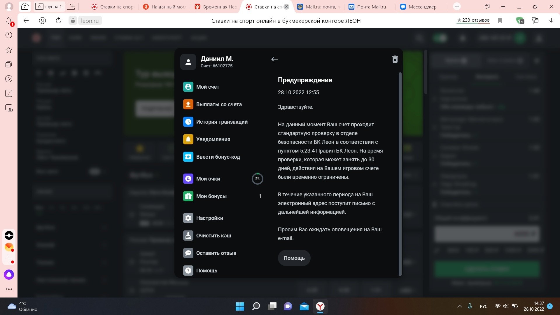 Приветствую вас LegalBet , случилось неприятная новость, выиграть то я выиграл ,а вот с выводом большие проблемы. Сначала прошел варификацию счета загрузил паспортные данные , подтвердил номер телефона, маил. Потом начал ставить, после моего выигрыша п.с( который удалили из истории по непонятным причинам ). У меня просили пройти повторную варификацию и так 3 раза , это клоунада какая-то . После успешной варификации , запросили выписку рублевого и валютного счета по моей карте в бумажно виде с печатью и подписью , я ее предоставил, после чего меня заблокировали и сказали ждать проверки 30 дней , не ставить не вывести деньги я не могу. Скрины прилагаю , для дополнительной информации могу прикрепить и другие скрины маил для связи . Надеюсь и верю ,что в конце я смогу вывести свои деньги . Также я занял первое место в акции под названием "Европейский экспресс" .