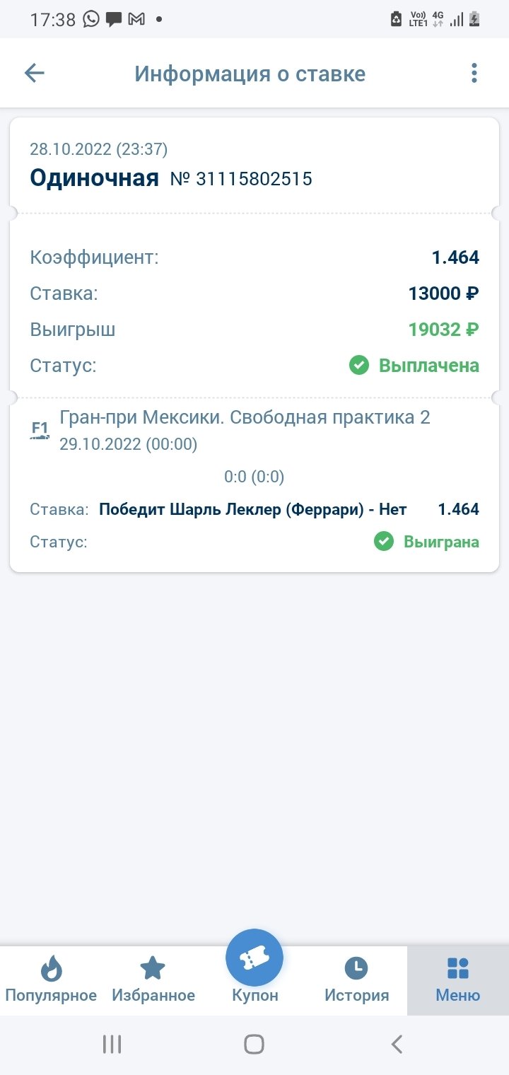 Доброе утро. Ставил на результат практики в Формуле 1 на событие "Леклер, 1 место -нет" за 1,6. Ставку приняли, событие завершилось, Леклер занял 7 место, но Фонбет решил рассчитать её возвратом, ссылаясь на свой "любимый" пункт о том, что якобы коэффициент был не правильный. Причём возврат уже ПОСЛЕ окончания события. Коэффициенты соответствовали примерно такие же, как и в других конторах, например 1х ставка. И 1х ставка мне всё правильно рассчитал, а тут букмекер не захотел проигрывать.