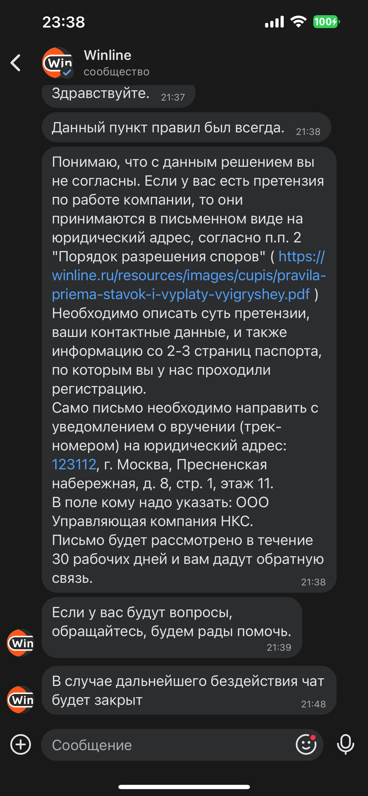 Здравствуйте! Мой логин: 8664983. Как не ожидаю «Аккаунт заблокирован на срок до 1 года, согласно п. п. » без объяснения причин! Из за баланс Миллионы или последние пари NHL??? Какая прелесть рекламы «WINLINE” Регистрация по “” в игре по хоккею, футболу , киберспорт , тенниса и блейбола. И я нарушил какие договорные матчи? Бывает проигрыш то считывай честная игра! На счету больше проигрывал. В своё время прошёл верификацию , индентификацию и вывести не было проблем. В нечестной игре. Я читал жалобы «» просто нет слов! Прошу вернуть денежные средств!