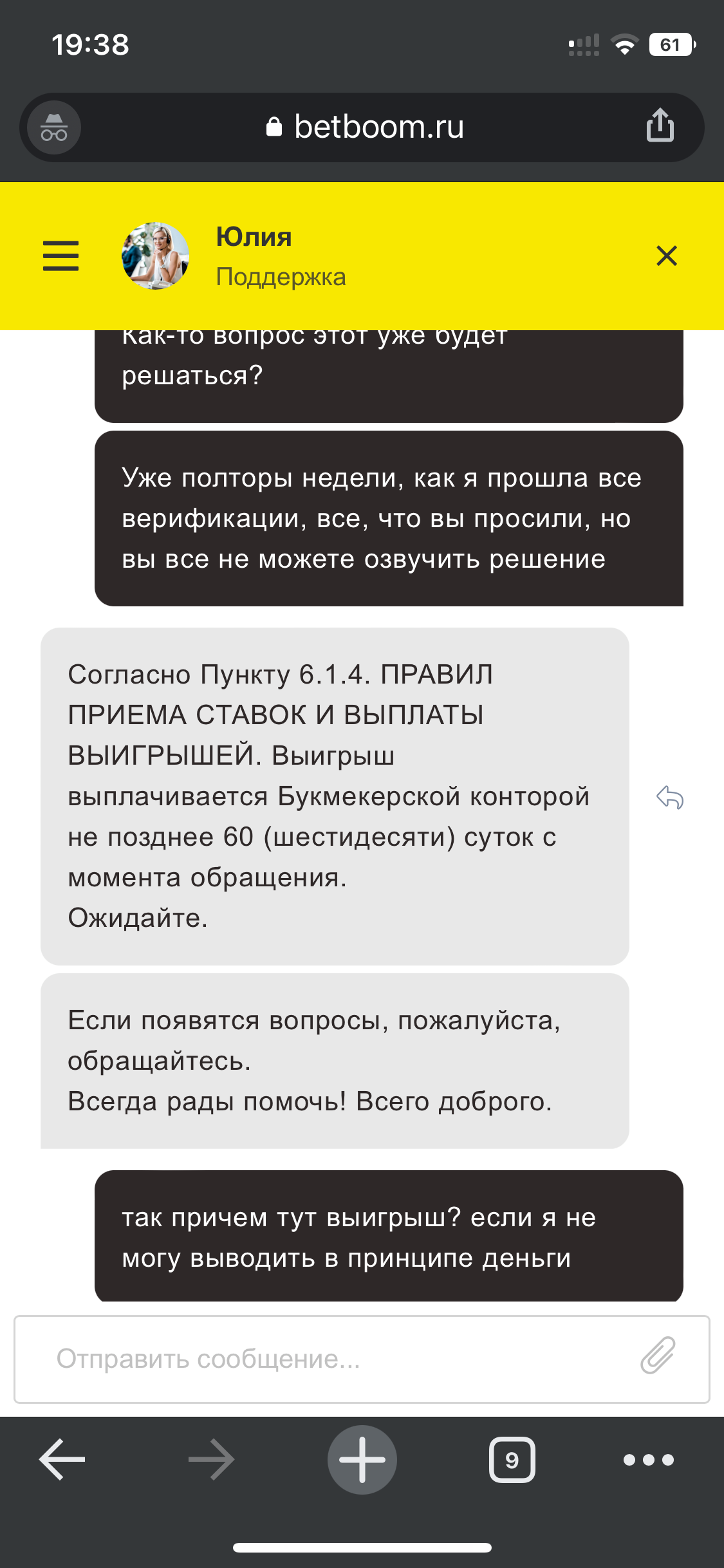 Здравствуйте, недавно после запроса документов для верификации, которые удачно прошли проверку БК Бетбум, получила уведомление о том, что потребуется дополнительно видеоверификация. Прошла, ответила на огромное количество вопросов, где на меня давили и на вопрос о количестве драконов в лиге легенд, я сначала ответила правильно, потом замешкалась. После прохождения звонка, сказали ждать 5 рабочих дней, чтобы вынесли решение по звонку, хотя вроде понятно было, что на видео я. После того, как прошло 5 рабочих дней, никакого решения принято не было, на вопрос: «сколько еще ждать решения?» ,мне ответили что никто не знает, ожидайте. Я конечно все понимаю, грубили на вопросы изначально, но сейчас даже четкого ответа дать не могут, неуважение полное ко мне как к игроку, помогите, как решить этот вопрос? Не могу не ставить, не вывести деньги, терпение все кончилось из-за хамского отношения изначально, помогите