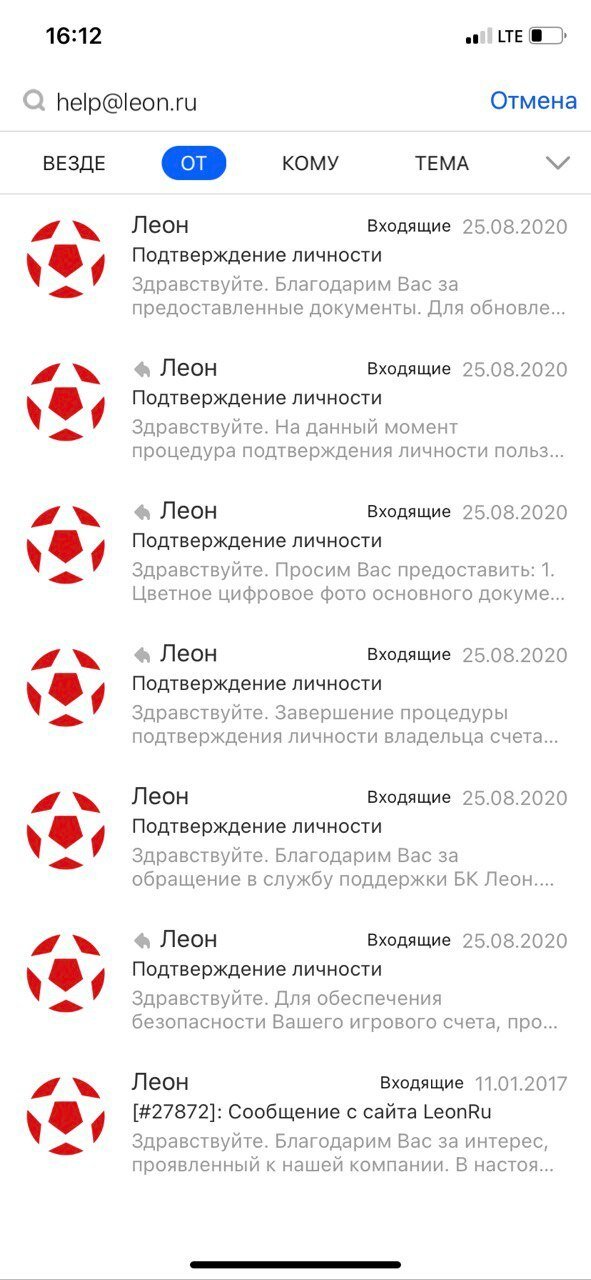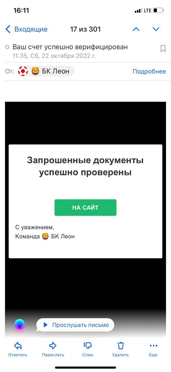 Добрый день, БК ЛЕОН запросила повторную верификацию счёта, которую я проходил в 2020 году (скриншот прикладываю), я в приложение сделал фото своего паспорта и селфи, через минут 15 пришло уведомление, все ок. Я сделал запрос на вывод средств, но запрос отклонили и написали, что мой счёт проверяется и это может длится до 30 дней, я конечно от этого в шоке, уму непостижима, посмотреть на фото документов и решить вопрос, конечно как было у нас беззаконие для одних, а на других плевать, так и продолжается. Почитал тут отзывы, один негатив, надеюсь моя жалоба будет удовлетворена в полном объеме, прошу администраторов легалбет помочь в скорейшем решение моей проблема и да, аккаунт там свой я никому и никуда не давал, просто восстановил с лимитами и начал делать ставки на то что принимает букмекер. Можете изучить мой профиль на легалбет и понять, что в гемблинге я не новичок и время от времени восстанавливаю аккаунты и проверяю на лимиты, бывало они становились более приемлемыми для того, чтобы было интересно ставить.
