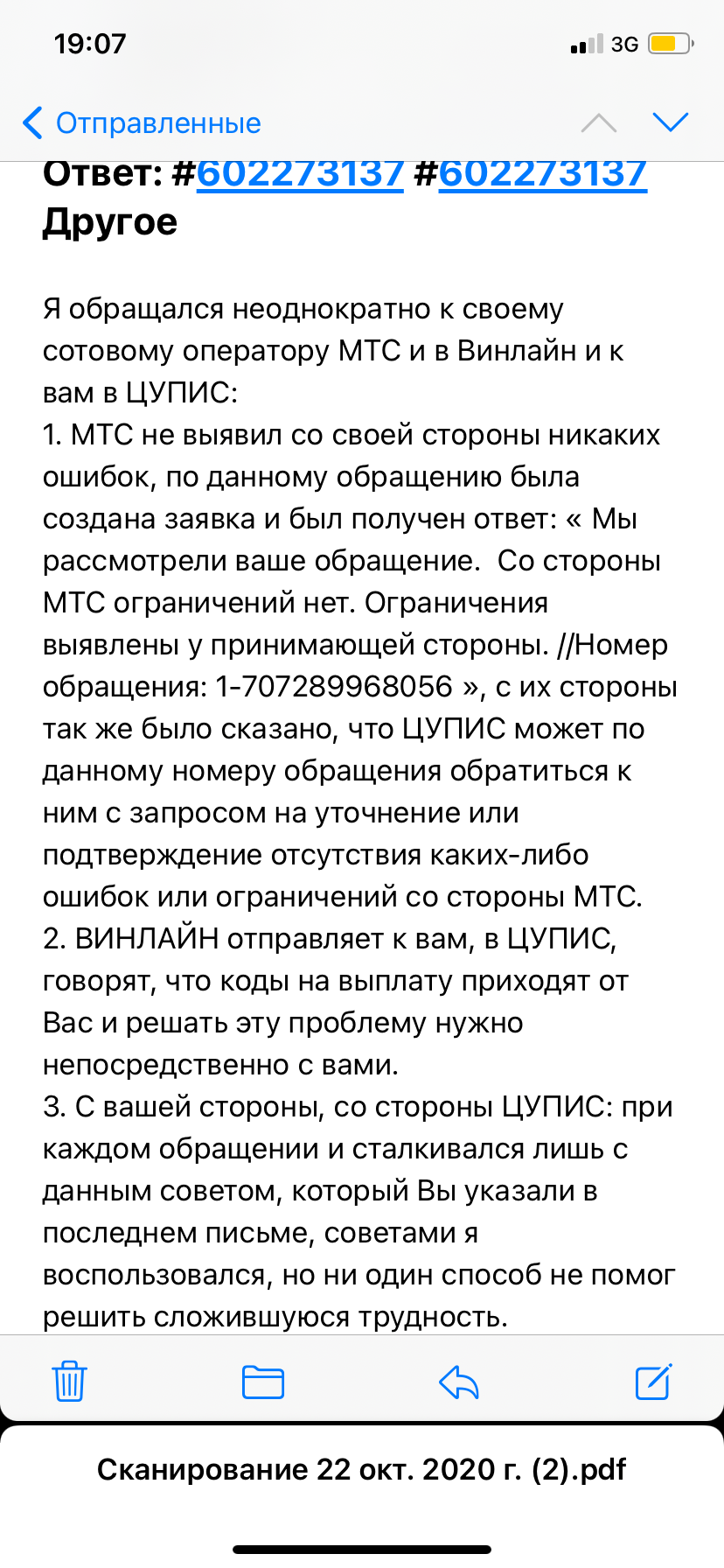 Добрый день! Решил зарегистрироваться в БК Winline, попробовать сыграть с их фрибетом на , поставив на Евро 2020, на победу Дании, далее пополнил счёт на через ApplePay, поставил на победу Бельгии, после расчёта ставки пытаюсь вот уже третий день вывести выигрыш, уже даже пополнил счёт с банковской карты, чтобы появилась возможность вывода так же на банковскую карту - безуспешно, на пополнение код приходит, на вывод - нет. Связывался с оператором сотовой связи, подключили тех поддержку, те в свою очередь неполадок со своей стороны не выявили, написали сообщением, что ошибка со стороны БК (Мы рассмотрели ваше обращение. Со стороны МТС ограничений нет. Ограничения выявлены у принимающей стороны. //Номер обращения: 1-707289968056). Звоню в БК каждый день по несколько раз - «наши сотрудники заняты, пишите на почту» и сбрасывается звонок сразу, вчера, написал им на почту - ответа так и не получил, приехал в отделение самой БК, там девушки развели руками, мол у них с мобильным приложением разные платформы и они не могут помочь в данном вопросе, говорят единственный способ - это дозвониться или написать на почту. Единственное забавное в данной ситуации, это слоган БК: «Букмекер, который платит без вариантов!» Как решить эту проблему?