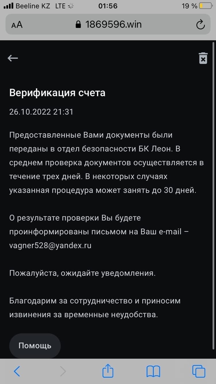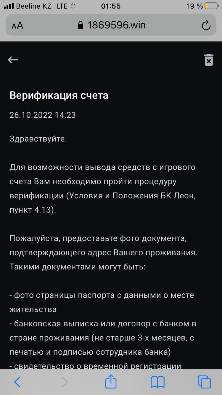 Здравствуйте! Зарегистрировался в БК Леоне очень давно, несколько лет назад. Проиграл за все время несколько десятков тысяч. В этом году, а именно в августе решил попробовать снова. Начал хорошо изучать футбольные матчи и начал ставить снова. В итоге стал выигрывать больше, чем проигрывать. По степенно начал выводить свой выигрыш. Сначала вывод был без проблем. Потом с увеличением суммы вывода стали запрашивать дополнительную верификацию счета. Сначала просто попросили подтвердить личность - подтвердил. При следующем выводе средств запросили фото номеров карт с которых я пополнял депозит + выписку из банка. Я все предоставил и деньги с трудом вывели. Снова при очередном выводе запросили фото паспорта с пропиской и далее попросили написать на листочке слово Леон, дату и сфотографироваться на фоне личного кабинета. Что? Серьезно?! В итоге и это я сделал, так как на счету уже было более 30 тысяч, а запрос был на вывод 5900. В итоге все отправил и приходит сообщение что в выплате отказано и все мои данные ушли в службу безопасности Леон. И ждать от них письма на почту в течении 30 дней! В итоге на балансе сейчас уже 58045 руб, которые просто висят в воздухе. При этом всю историю ставок мою удалили! Хорошо что я записывал все свои ставки , так как серьезно к этому подходил. Никаких правил я не нарушал, вилок и всякой ****** не использовал. Ставки все были на прематч. В итоге прошло уже пол месяца как меня просто динамят и никакого письма не приходит. Хотя я уверен, что как ты только начал выигрывать счет сразу решили заблокировать. Иначе я ни как не могу предположить другого исхода. Проигрывал - проблем не было. Стал выводить часто - проблемы появились. Все фотографии и скрины я сделал заранее. Если не разблокируют счет - буду делать видео с подробным объяснением как обманывает данный БК. Самое смешное что я еще и прямой партер данной БК. Естественно партнерскую программу я сразу приостановил. Скрины прилагаю.