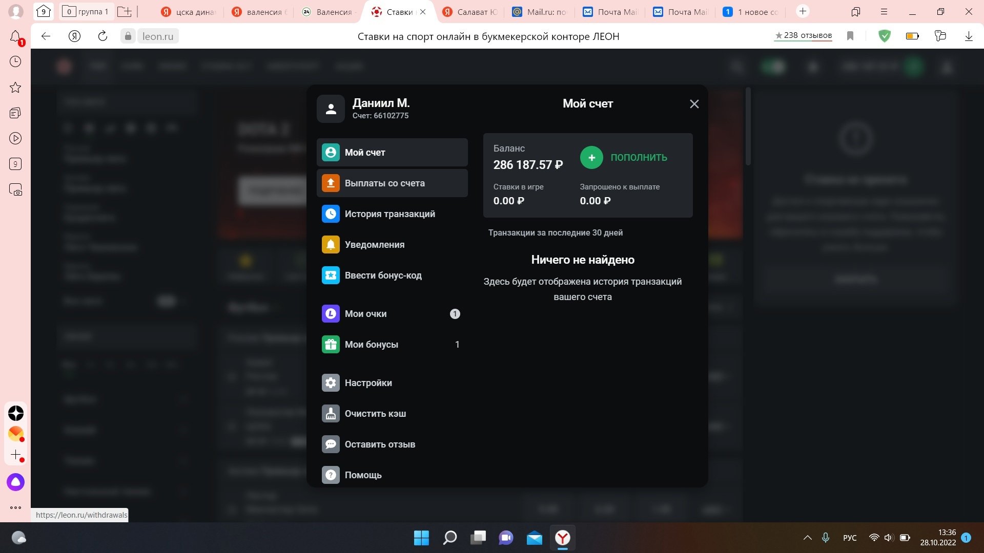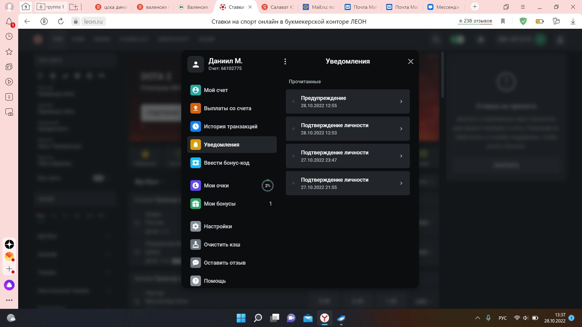 Приветствую вас LegalBet , случилось неприятная новость, выиграть то я выиграл ,а вот с выводом большие проблемы. Сначала прошел варификацию счета загрузил паспортные данные , подтвердил номер телефона, маил. Потом начал ставить, после моего выигрыша п.с( который удалили из истории по непонятным причинам ). У меня просили пройти повторную варификацию и так 3 раза , это клоунада какая-то . После успешной варификации , запросили выписку рублевого и валютного счета по моей карте в бумажно виде с печатью и подписью , я ее предоставил, после чего меня заблокировали и сказали ждать проверки 30 дней , не ставить не вывести деньги я не могу. Скрины прилагаю , для дополнительной информации могу прикрепить и другие скрины маил для связи . Надеюсь и верю ,что в конце я смогу вывести свои деньги . Также я занял первое место в акции под названием "Европейский экспресс" . (Прошло уже больше 10 дней (13) , если они еще больше затянут я не смогу обратиться за помощью , поскольку после видеозвонка в котором мне должны сообщить разблокировали ли меня мне надо будет ждать еще 10 дней) . В общей сложности проверка может занять больше 30 дней , поэтому решать вопрос надо сейчас