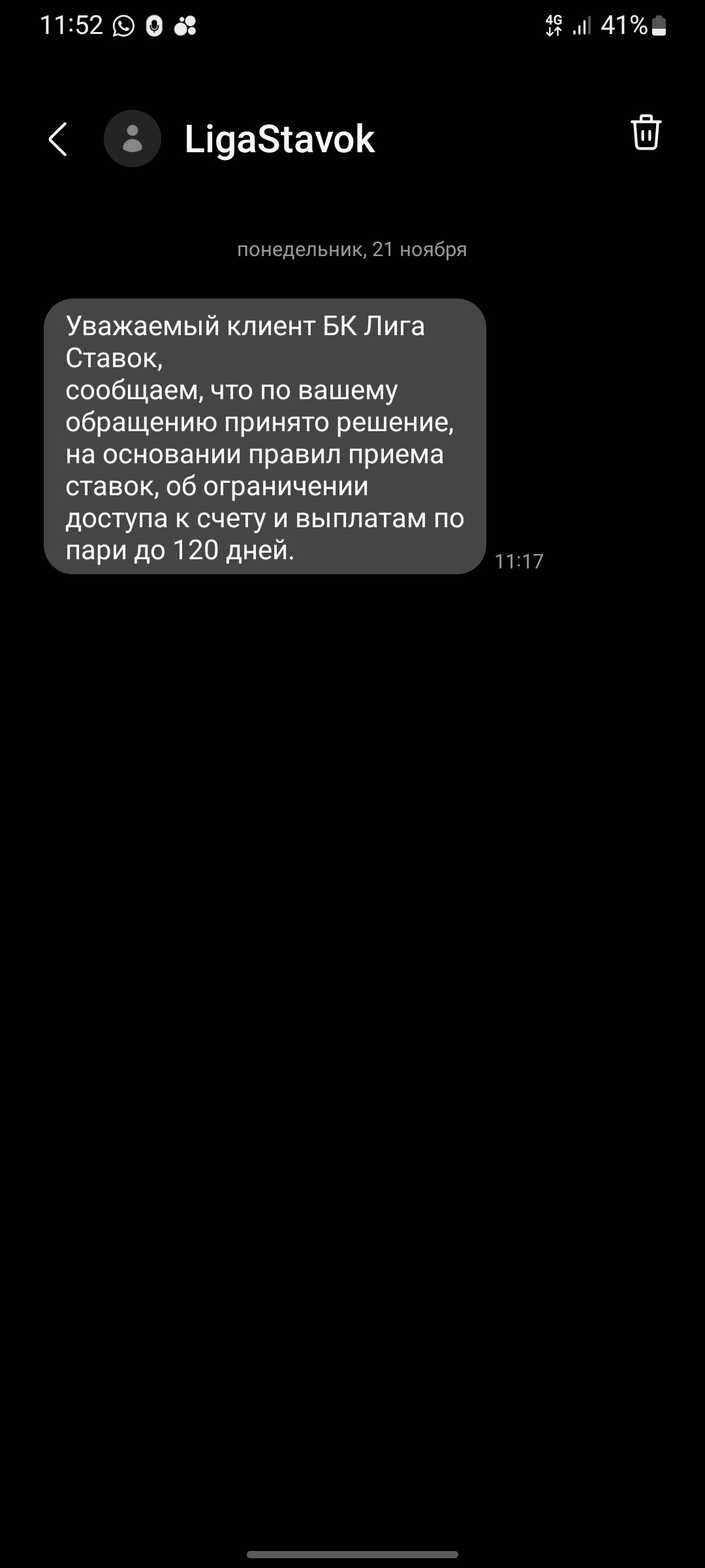 Добрый день, 22 октября у меня заблокировали карту и средства находящиеся на карте в Бк Лига Ставок,( город Санкт-Петербург) Играю в Лиге Ставок уже очень давно,являюсь Vip клиентом ,бывает по разному бываю в минусе бываю в плюсе держу средний баланс ,вдруг ни с того ни с сего прихожу делать ставку а моя карточка неактивна. Ни разу с такой ситуацией не сталкивался ,и не знаю что делать ,и как быть .На все мои вопросы сотрудники клуба ответа мне не дают,звоню на горячюю линию мне говорят что ваш вопрос уточняется ,и ни каких обьяснений и причин не называют! У меня на счету примерно 300 тыс рублей, помогите разобраться с данной проблемой ,с момента блокировки прошло уже 20 дней!
