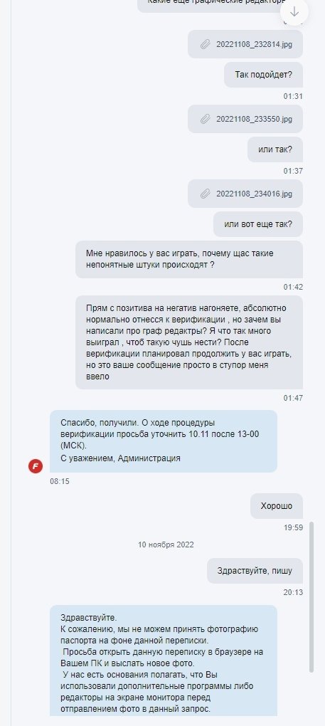 Зарегался на сайте 26 октября, играл 3 дня на их сайте, потом мне скнизили лимиты до 300р и на выводе ошибка " Выплаты недоступны. Пожалуйста, свяжитесь с нашей поддержкой." Код ошибки: 101 Написал им, отправил фотографии, назначили мне созвон, думал просто позать паспорт, но нет, стали расспрашивать про ставки, пополнения, виды спорта, сложности ответить не составило, ответил на все вопросы, кроме вопроса что такое буллиты. Думал после прохождения такого собеседования разрешат дальше ставить или хотя бы откроют вывод, но нет) В конце созвона сказали им в чат время написать, написал! После созвона опять просят новые фото. После очередной фотографии написали - "До тех пор, пока Вы будете редактировать фотографии при помощи графических редакторов, ограничения сняты не будут. Прикрепите новое фото паспорта с перепиской. На экране должно быть последнее сообщение. Ожидаем фото оперативно. Все требования, указанные ранее, должны быть соблюдены. С уважением, Администрация" Я естественно никаких "графических редакторов" не использовал, отправил им на это 3 фото под разными ракурсами, чтоб не несли чушь, на что они ответили)))) - "Здравствуйте. К сожалению, мы не можем принять фотографию паспорта на фоне данной переписки. Просьба открыть данную переписку в браузере на Вашем ПК и выслать новое фото. У нас есть основания полагать, что Вы использовали дополнительные программы либо редакторы на экране монитора перед отправлением фото в данный запрос. Просим Вас выслать фото оперативно, в течение 20 минут с момента прочтения данного сообщения. С уважением, Администрация" Скинул им еще раз фотографию, переписоваться с поддержкой смысла не вижу, они не хотят отдавать деньги и пишут про "граф редакторы" какие-то "дополнительные программы" В общем очередная скам контора