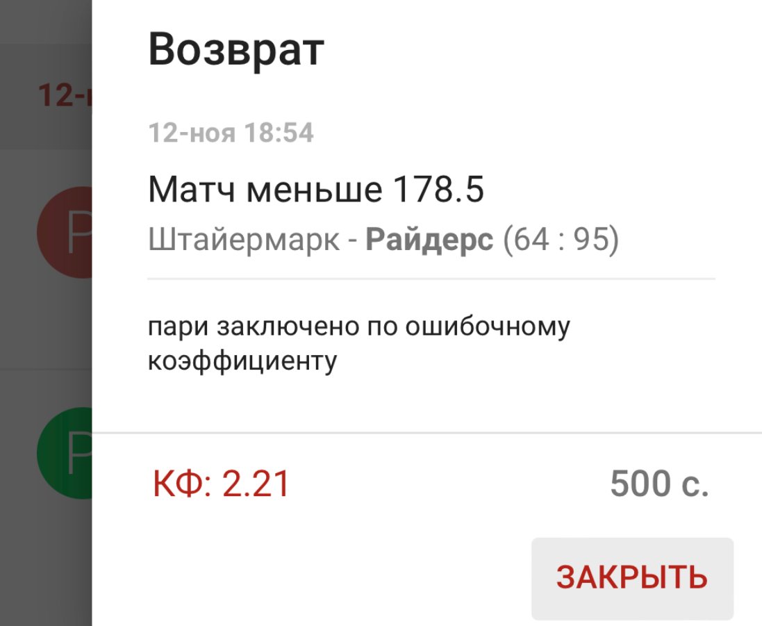 Матч Штайермарк - райдерс Тотал матча меньше 178 Счет закончился 64:95 Итог: пари заключен по ошибочному коэффициенту