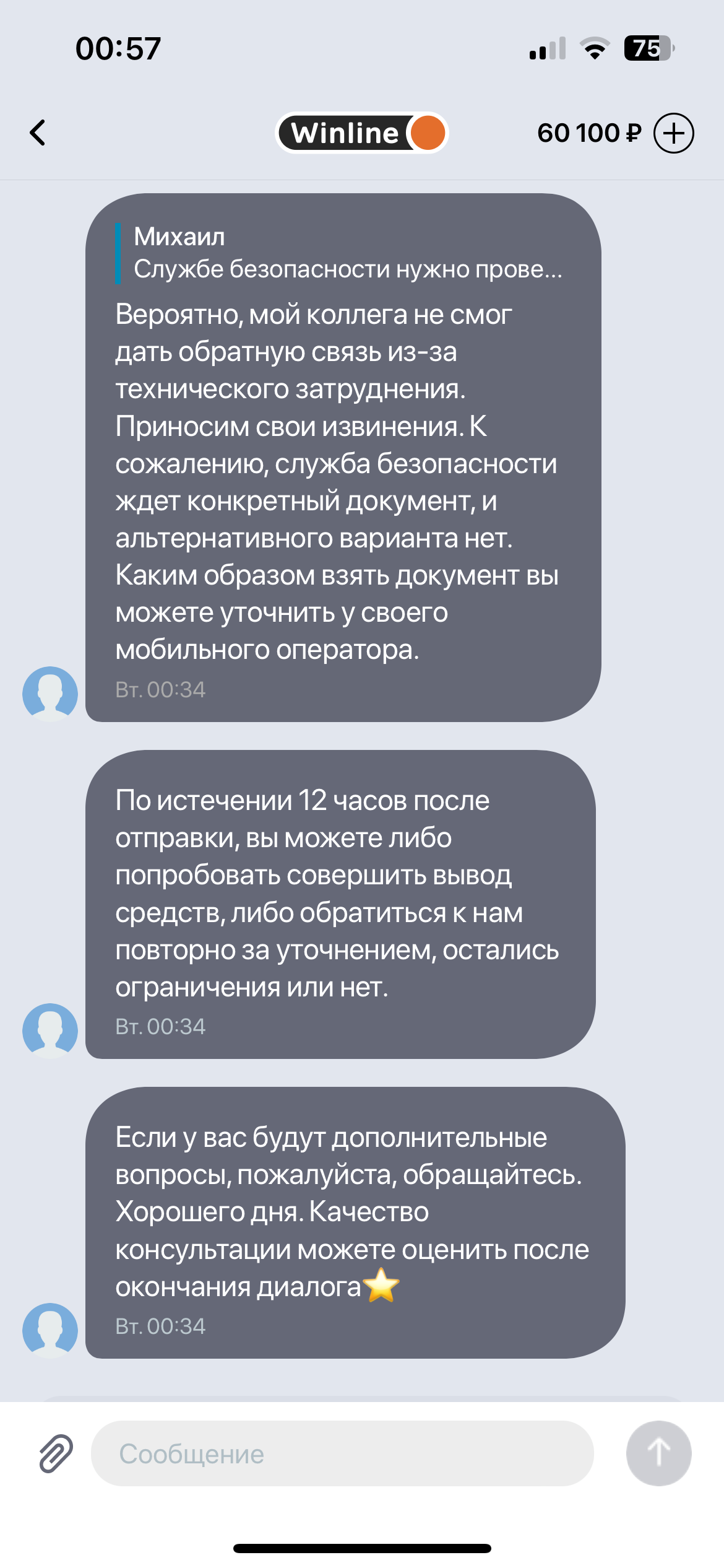 Добрый день ! В течении последних дней выиграл около 100 тысяч в винлайне (хотя в очень большом минусе там за свою карьеру) ! Вывел немного так как играю лет 10 , не подозревал что окажутся мошенниками остальное оставил на счету ! На след. день прилетает повторная верификация , позвонили по видео показал паспорт и второй документ , сказали вы все прошли успешно ! Вывести не дают , просят договор с киви кошельком что владельцем являюсь я , без проблем отправил через пару часов , далее просят договор с оператором сотовой связи , мне его не дают ! Помогите пожалуйста , знаю что вы помогали в этом вопросе людям ! Ну что за мошенники сидят в этих конторах которые не могут расстаться с деньгами ? Получается что ставить надо только в ппс ? , через приложения они не хотят платить ?! Мне неоткуда взять этот договор с оператором !