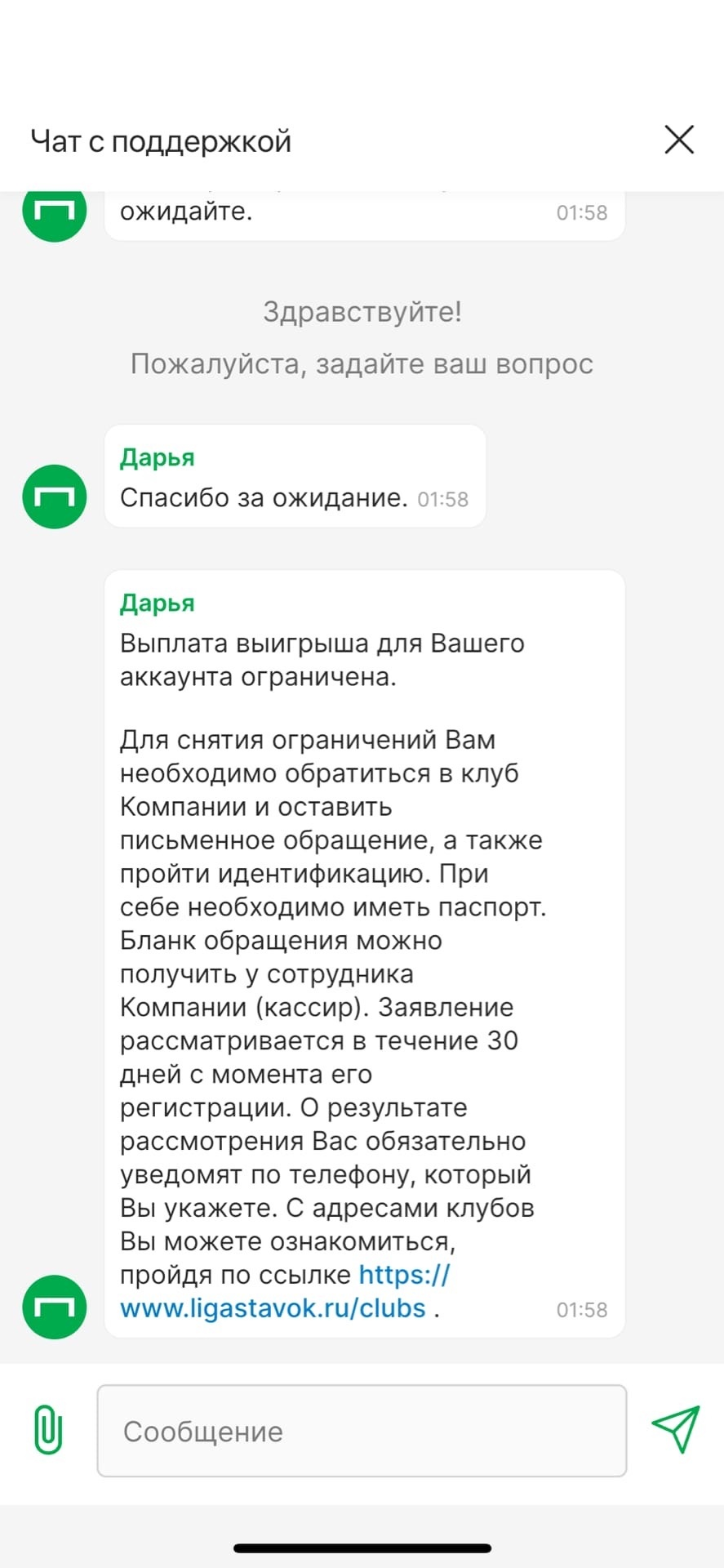 Скриншот переписки с поддержкой