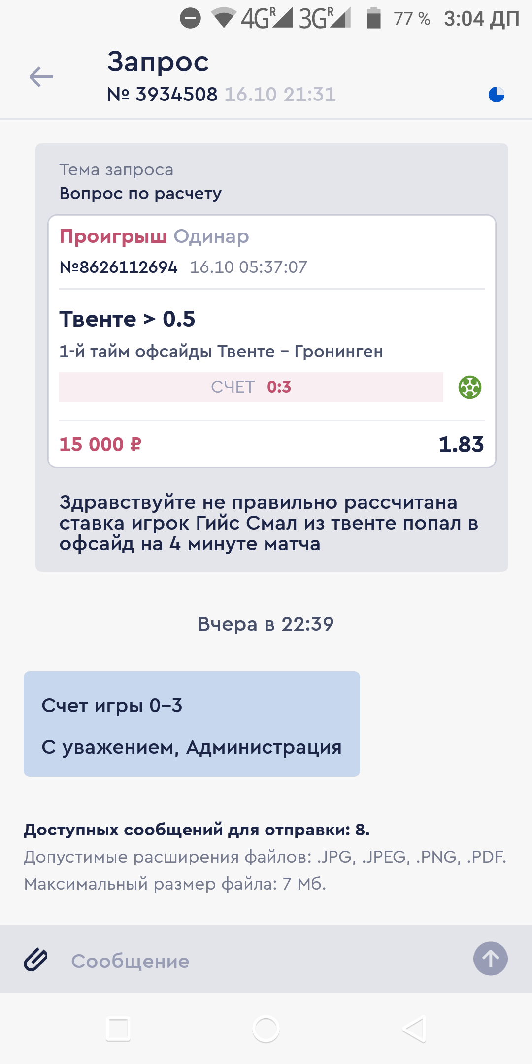Здравствуйте. Мне уже больше месяца не рассчитывают выигрышную ставку. Сотрудник говорит что ставка проиграна. Ставка была на то что команда твенте попадет в офсайд в 1 тайме. Игрок Гийс Смал из твенте попал в офсайд на 4 минуте. В поддержке сказали что результат считают по сайту . На этом сайте нет статистики по таймам, есть только текстовая трансляция матча, в ней также указано что данный игрок попал в офсайд на 4 минуте 1 тайма. Сотрудники не отвечают на мой запрос уже месяц, в поддержке говорят они чем то заняты месяц. Помогите пожалуйста забрать мои выигранные деньги. Спасибо