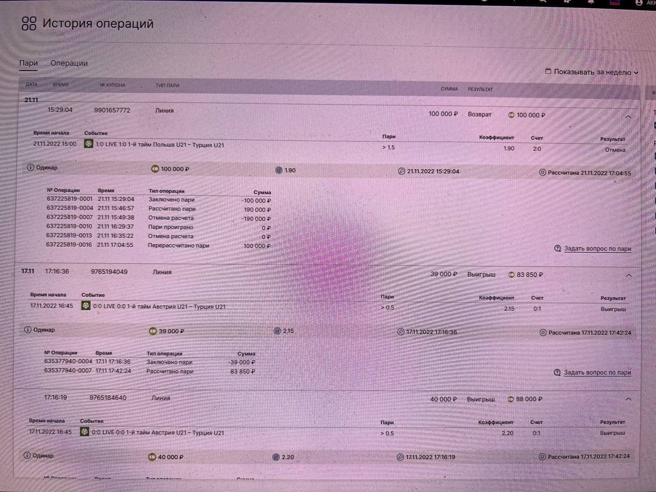 Добрый вечер, поставил сегодня несколько ставок на матч Польша U21 – Турция U21(товарищеские матчи). Лимиты были порядка 200 тысяч рублей. Я и прежде ставил на матч Австрия U21 – Турция U21(в рамках того же тов. турнира) за пару дней до этого крупную сумму, она зашла - всё рассчитали. В этот раз начались проблемы. Ставку сначала рассчитали минусом, потом рассчитали плюсом, потом её взяли и отменили. Ссылаются на пункт Правил: 4.5.2. Как оказалось позже, эту ставку давали в одном из известных телеграмм каналов - и многим рассчитали ставку плюсом, кому-то так же отменой - логика решения не понятна и не справедлива, почему кому-то рассчитывают плюсом, кому-то минусом ссылаясь на правила, отсюда навеивается вывод, что БК ЗЛОУПОТРЕБЛЯЕТ своими правилами чтобы не платить крупный выигрыш. Прошу справедливости и честности.