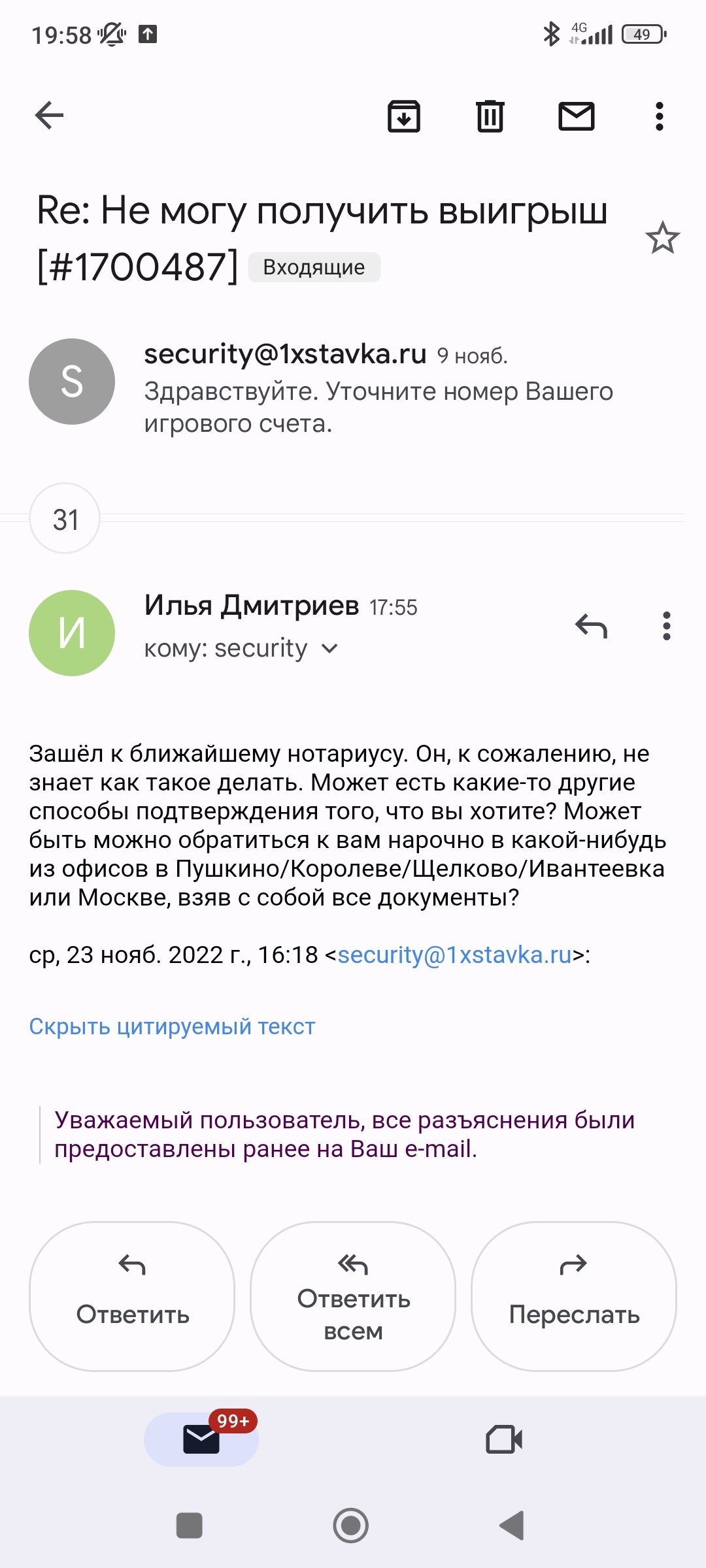 Добрый день. Попытался снять часть средств в 1xstavka, однако получил отказ и требование об обращении в службу безопасности данной организации. В тот же день запросили фото паспорта - отправил. После - фото паспорта под другим углом - отправил. Далее фото договора на оказание услуг связи - отправил, счет на оплату услуг связи - отправил, счет на оплату услуг связи напрямую в 1xstavka - отправил, фото с паспортом на фоне переписки - отправил. Теперь не могу сделать ставку, т.к. сумма пари от 20 руб до 0,01 руб. Также получил смс с содержанием: "ООО "Букмекер Паб" требует от Клиента ЛК № 463177599 выполнить п. 10.6.2. Правил азартных игр, подробности на e-mail (прикладываю скрин). Зашел я сейчас к нотариусу, а он и понятия не имеет что это как это сделать. Более того, при регистрации я проходил процедуру подтверждения личности нарочно в салоне связи Связной. Как я понимаю, данная недобросовестная организация просто не хочет выплачивать мне мой выигрыш. Убедительно прошу посодействовать в решении моего вопроса.