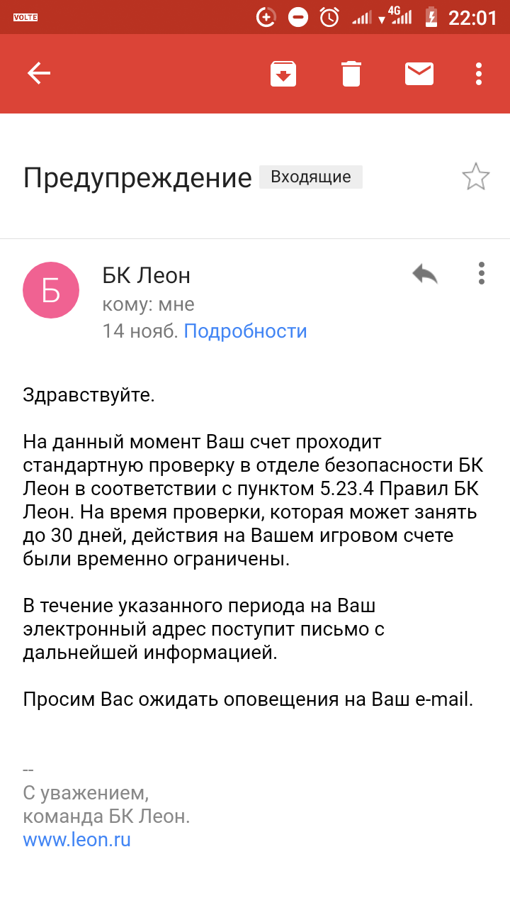 Здравствуйте. Сделала ставку бк Леон .Ставка зашла ,выигрыш 5000тыс руб. Для того чтобы их вывести ,запросили ещё одну ставку . Поставила ,ставка зашла ,выигрыш 1140тыс руб. Суммарно потребовала для вывода 6140. Потребовалось пройти пройти верификацию, она была успешна пройдена и после этого заморозили счет ссылаясь на пункт .4. До сих пор не получила от них уведомление о том что проблема решена. Помогите разобраться.