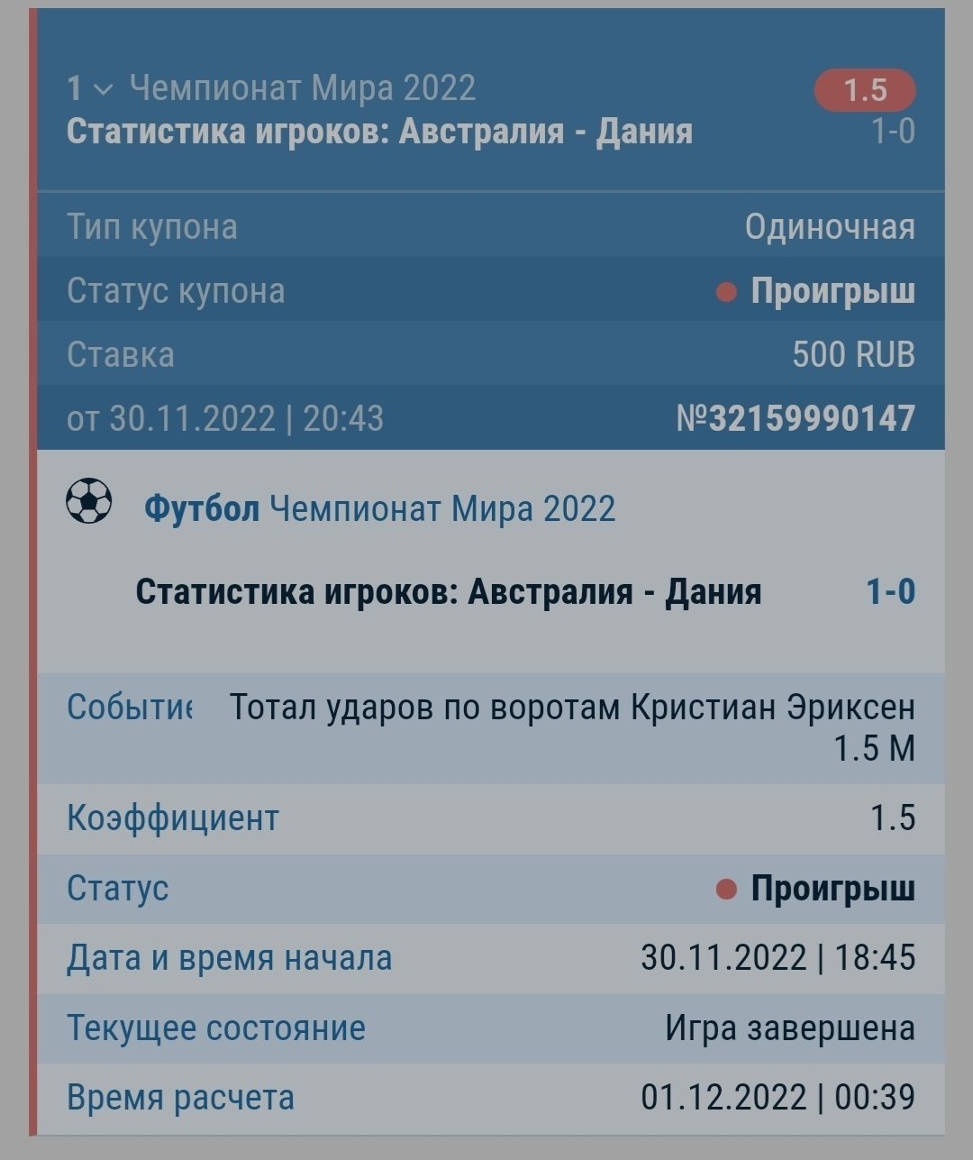 Ставка №32159990147 была сделана в лайве на 80 мин. матча. Игрок, на которого сделана ставка, совершил 1 удар на 58 мин. согласно хронометражу официального сайта (линк: ). Помимо этого, альтернативный статистический источник (на которого часто ссылается данная БК) так же указывает один удар (см. скриншот). В переписке с поддержкой БК дается один ответ на все доводы: "Ваш купон рассчитан верно, согласно официальному протоколу матча.". Прошу более детально разобраться в ситуации и повлиять на перерасчет ставки.