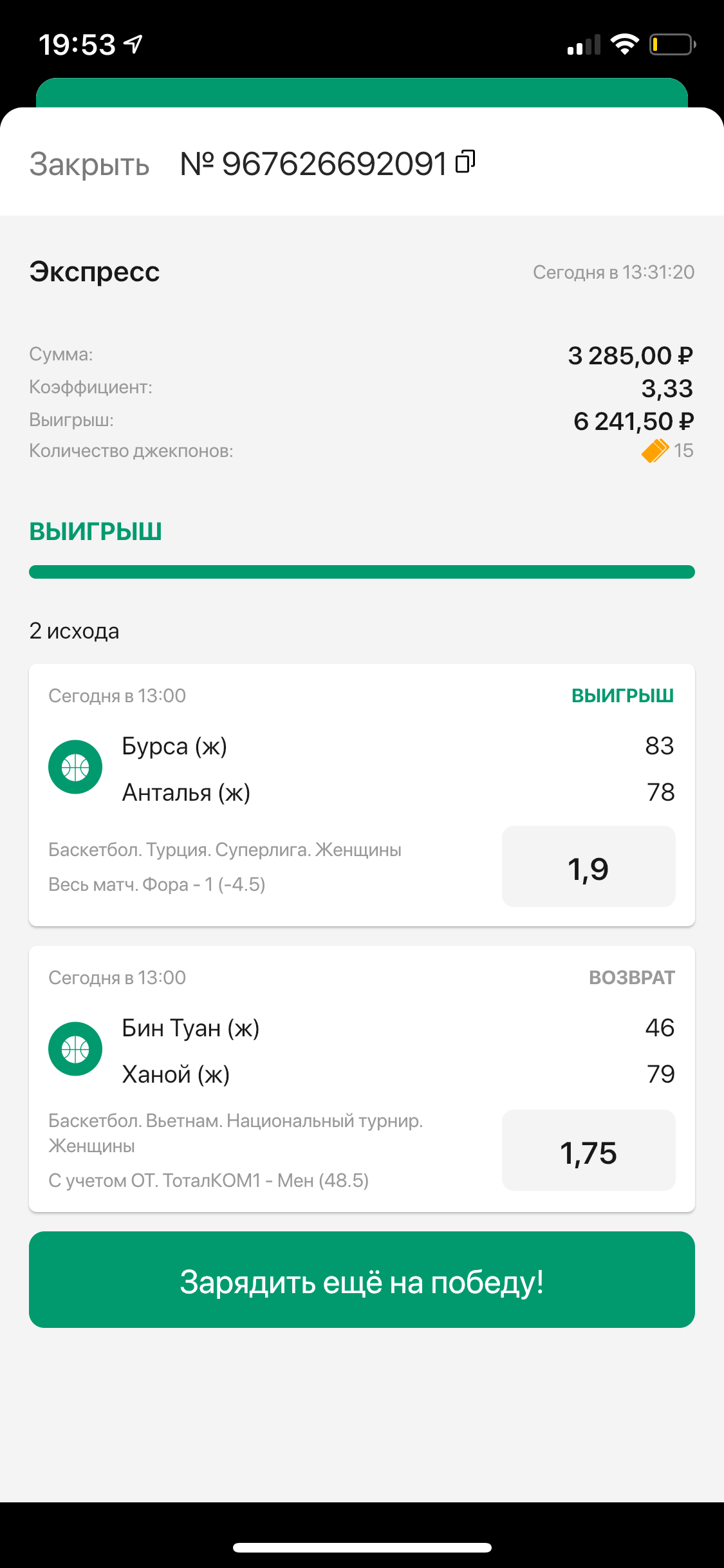 Добрый вечер. Сделал пари 967626692091 кспресс, матч на официальных источниках завершился 48:79. Букмекер сделал возврат выигрышного пари.