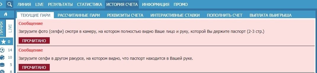 Здравствуйте, нет,, конторе всё было предоставлено, несколько раз и в разных вариантах. С неделю назад они закрыли не только вывод, но и возможность ставить. Потом их наглый биоробот придумал, что ему нужно селфи с номером телефона, текущей датой и словом "Бетсити", я отправил это, он тянул время, пока не наступил следующий день, потом он снова рисует ошибку верификации и запрашивает то же самое. Я опять отправляю, он опять отклоняет, я спрашиваю в поддержке, которую нужно ждать несколько часов каждый раз, в чем дело, говорят, что теперь это селфи нужно загрузить в форму для разворота паспорта с регистрацией. Я загружаю, проверка длится 4 дня, хотя, как они говорят, максимум 24 часа, спрашиваю, в чем дело, просят опять селфи с актуальной датой, отправил, просят паспорт и лист с датой в разных руках, отправил. После чего счет заблокирован без всяких оснований и объяснений. В общем, какой-то канцелярий, нанятый выполнять самые примитивные обязанности, творит что ему вздумается, пользуясь безнаказанностью. Сейчас уже 4 часа жду ответа поддержки по этому поводу. Прошу снять ограничения и прекратить эти издевки.