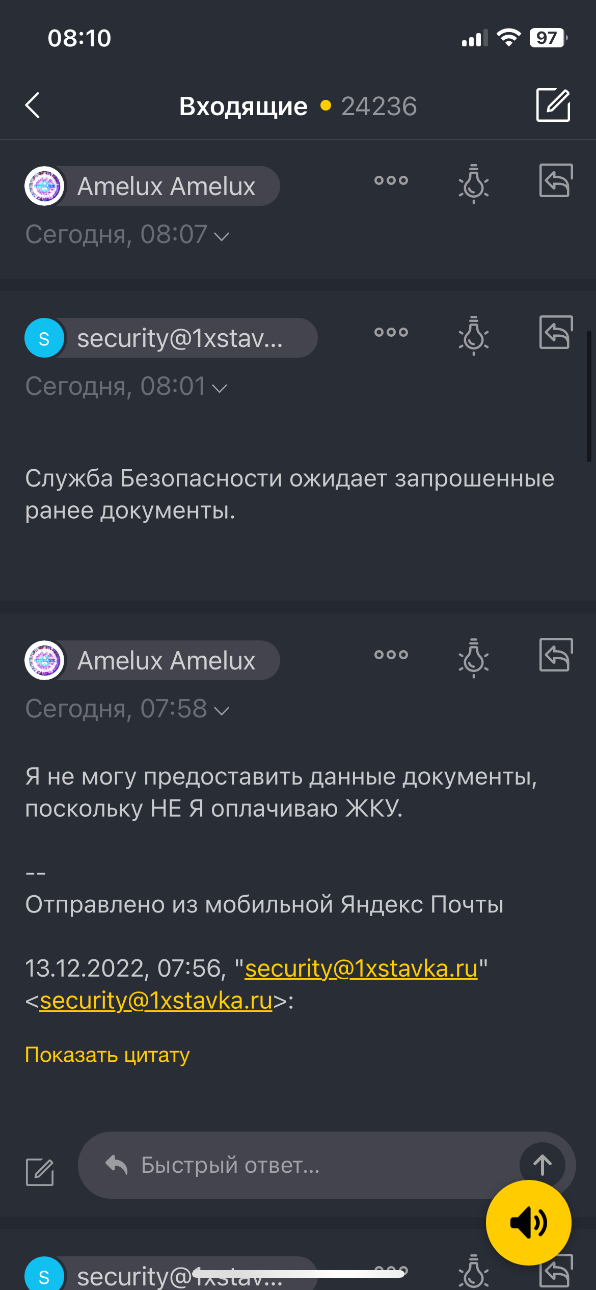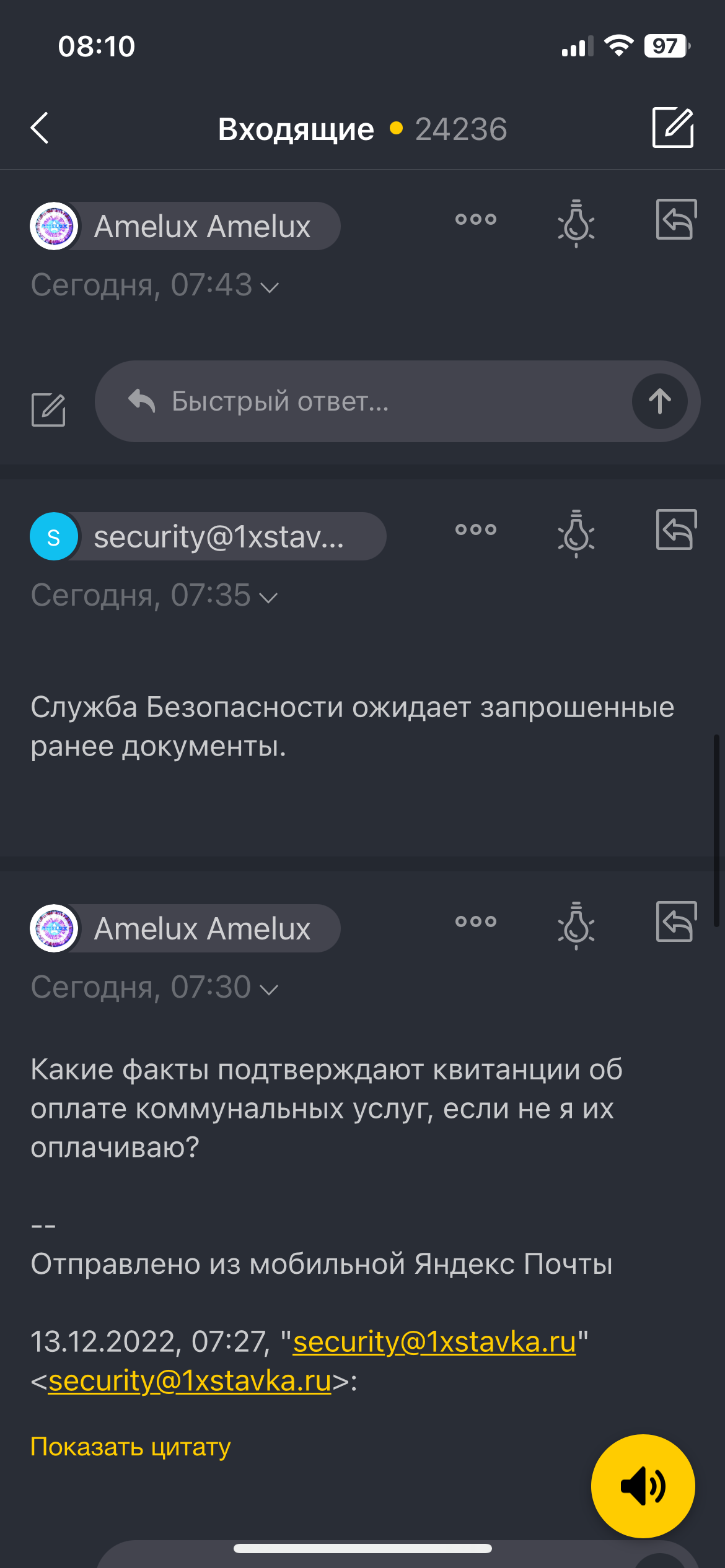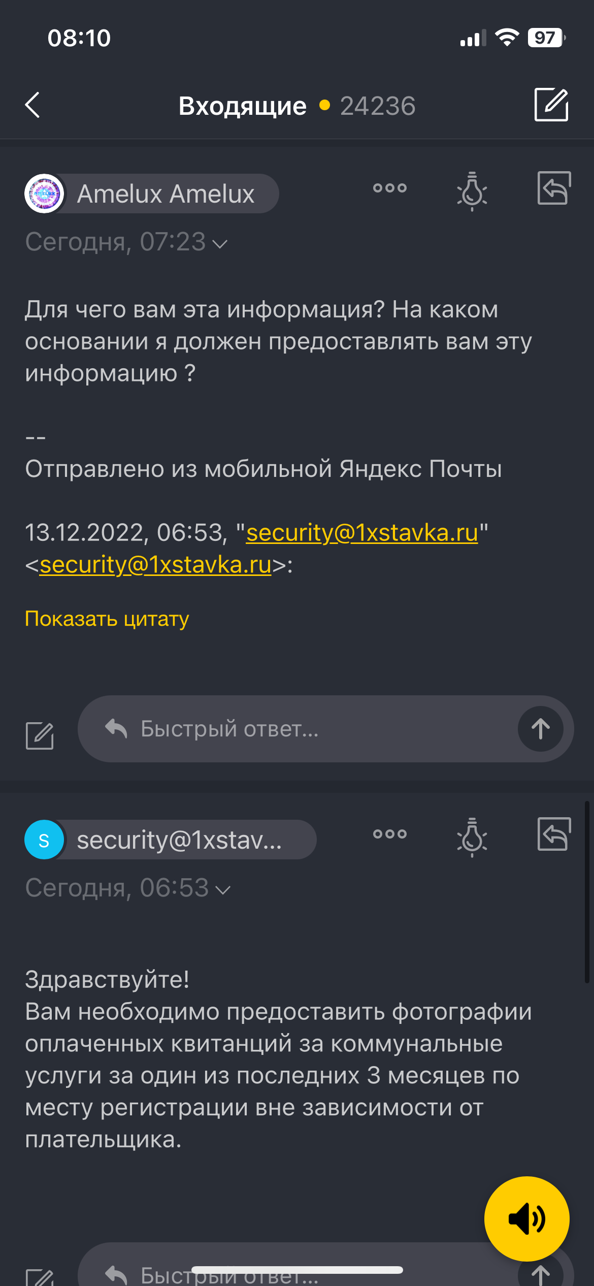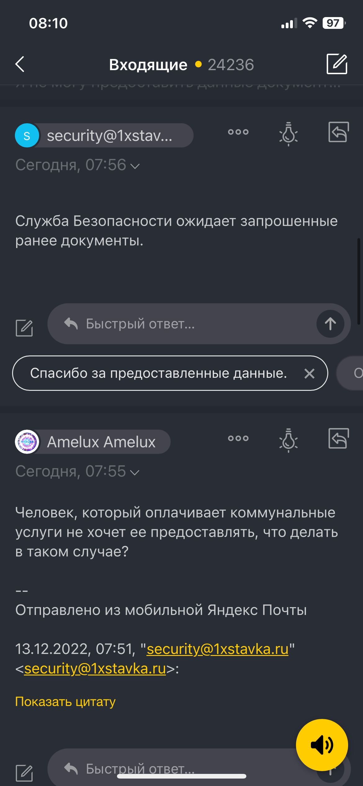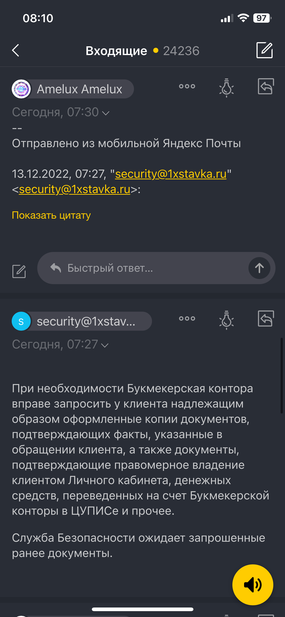 Произвел регистрацию в 1хСтавка, все данные в ЦУПИС у меня подтверждены. Пополнил баланс на 70000, выиграл двумя ставками около 30000 рублей, после этого не могу вывести ни свой депозит, ни всю сумму. Запрашивают документы, отвечают по 3 дня, это в лучшем случае. Паспорт направил, проверили, карту мою проверили, выслал фото свою на фоне паспорта и переписки со службой безопасности. Я не понимаю, на каком основании они теперь запрашивают мой договор с оператором? Да еще и оригинал. Номер переходил с одного оператора на другого, мне выдавали только соглашение об уступке прав и передаче обязанностей. Как мне вывести хотя бы свой депозит без подтверждения всех этих документов? Это мои деньги, которые я пополнил на баланс букмекера, цупис никакие ограничения мне не выставлял. Помогите, пожалуйста, решить вопрос. Мне деньги нужны в скором времени. В поддержке помочь не могут, просто говорят, чтоб я ожидал в среднем 72 часа(даже точных сроков не называют, типо в порядке очереди)