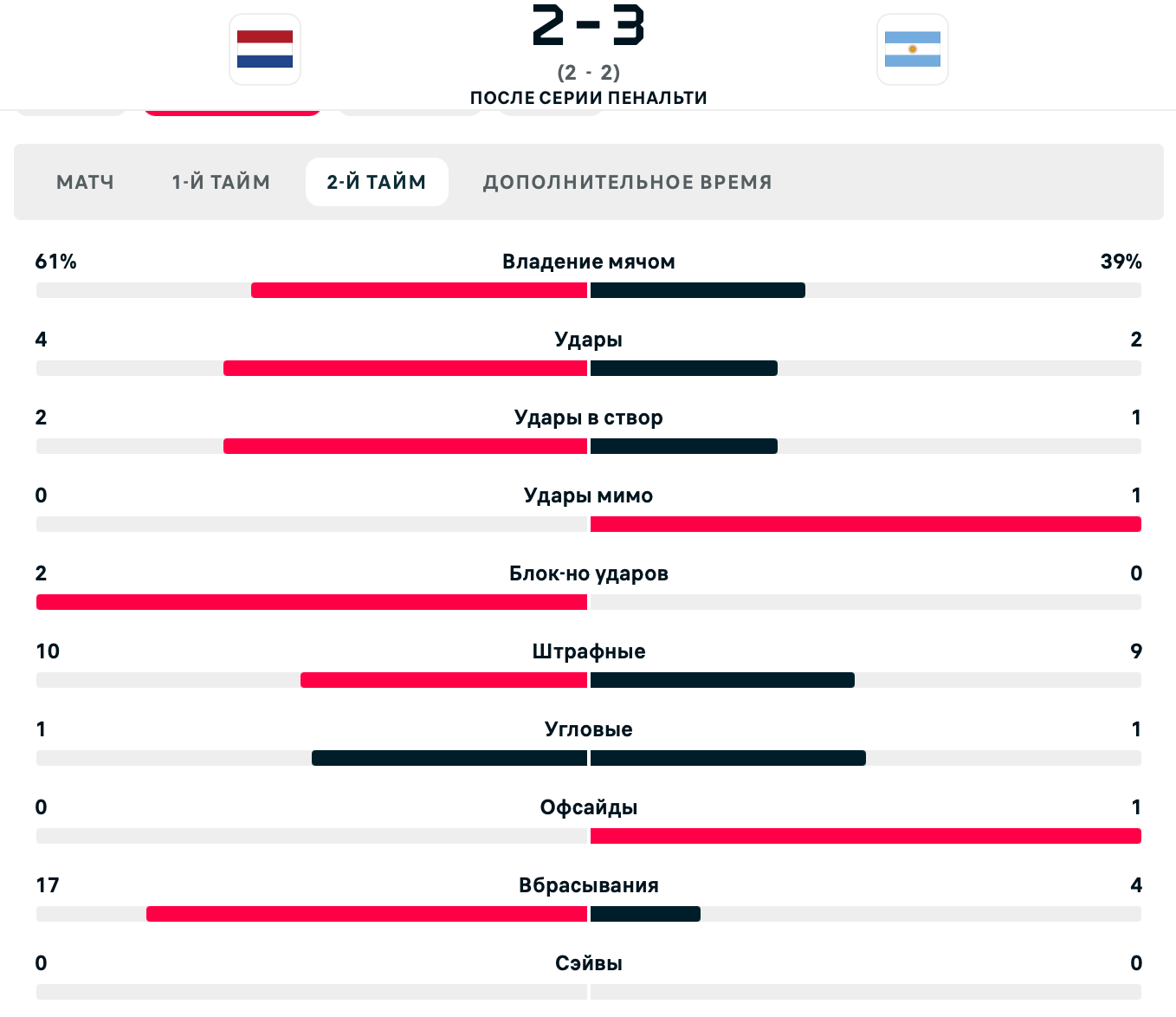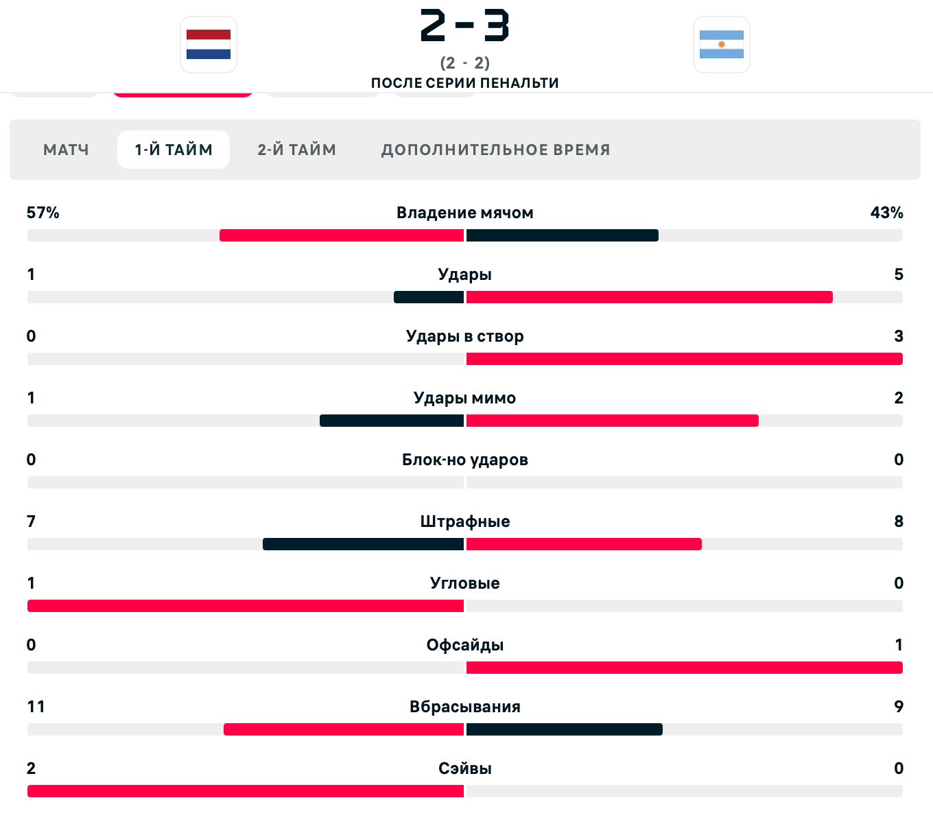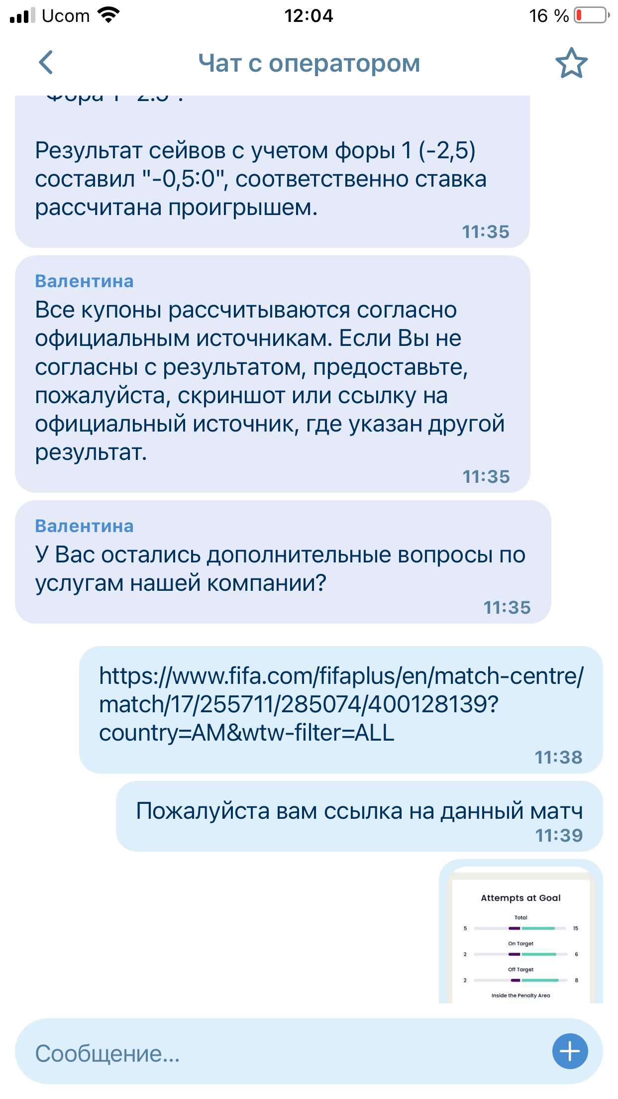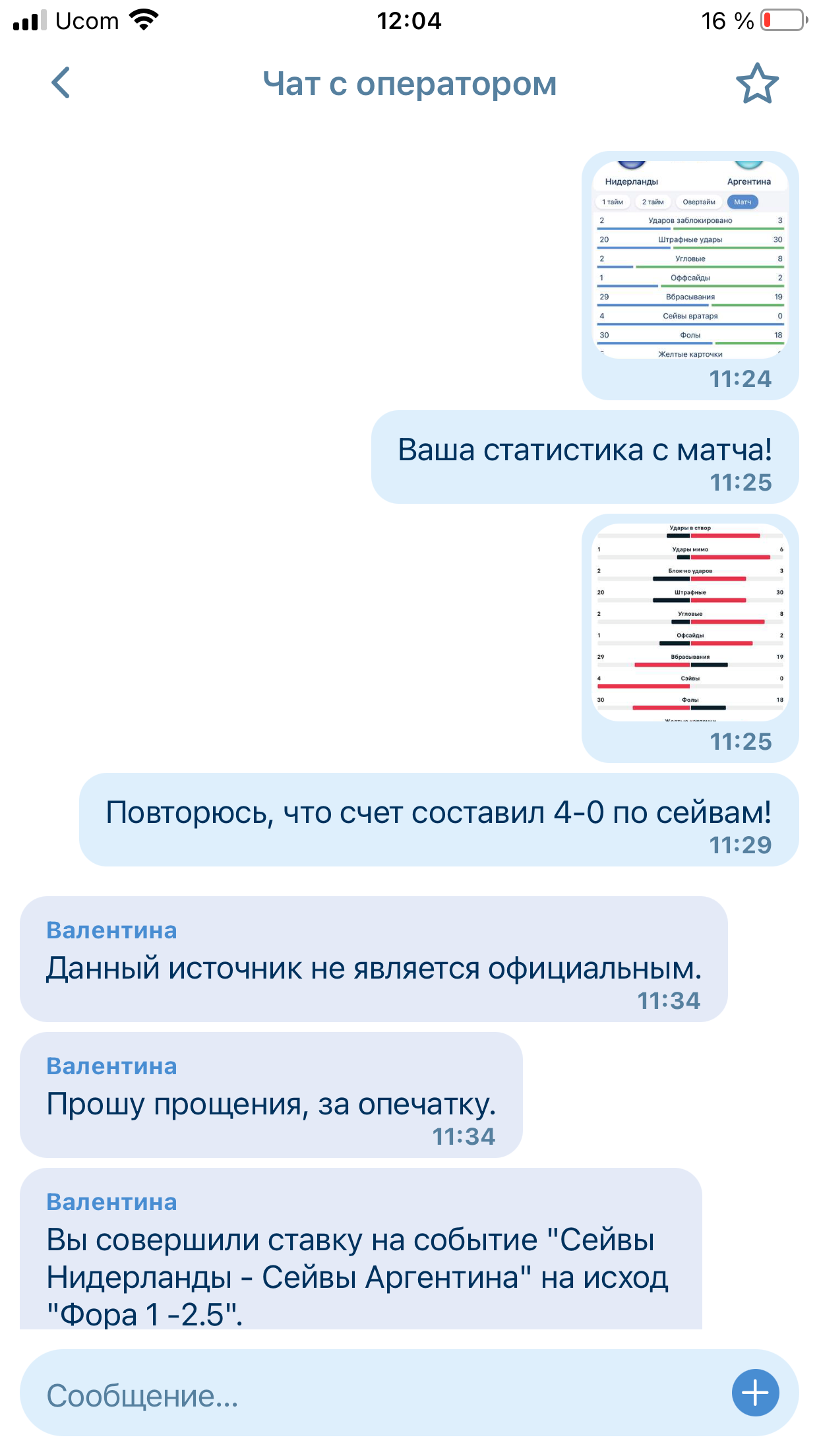 Добрый день! Мой id:152046779. Ставила на матч плей-офф чемпионата мира 2022 Нидерланды - Аргентина на сейвы вратарей в матче. А точнее на ф1 -2.5. По итогам данного матча было 4 Сейва со стороны Нидерландов и 0 сейвов со стороны Аргентины, соотвественно ставка должна быть рассчитана как выигрыш, но букмекер 1х решил рассчитать по своему и рассчитал со счетом 2-0, также на различные запросы со стороны Бк информации с официальных источников информации мной все было предоставлено. Прошу помочь в разрешении данной ситуации.