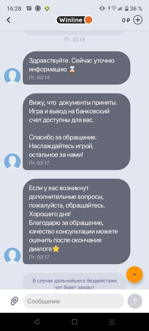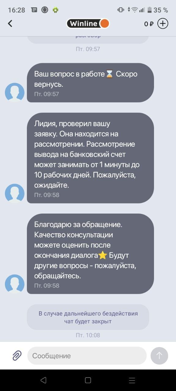 Винлайн не платит - без вариантов и уже больше месяца! Такой можно придумать заголовок. Итак, по порядку. Впрочем, ситуация моя не нова, но сегодня была последняя капля. После относительно удачных ставок в плюс мой аккаунт был заблокирован (ну да, подозрительно ведь, когда человек выигрывает). Произвели видеозвонок, где показала карту и паспорт. Доступ, вроде как, дали. Дальше при выводе вновь попросили кажется сфотографировать карту. Сказано - сделано. Дальше уже начинается магия. Вывод доступен только на реквизиты счета, что, в общем-то, меня не огорчило. А вывода все не было и узнав, в чем дело получаю сообщение, что необходимо отправить фото бумажного договора на использование банковской карты с печатью. Данное фото было отправлено, и, хоть не с первого раза, но принято. Далее попросили сделать селфи с паспортом и справкой из банка на фоне переписки с их конторой! Просто жесть. Искала друга, у которого есть плазма, которую можно подключить к компьютеру, чтобы этим сотрудникам было видно на фоне переписку. И знаете что, им не видно текста! Ну, разумеется, им не видно, так как выплачивать выигрыш нынче не в моде, и не у всех людей есть деньги приобрести себе условный iPhone 14 Pro Max для классных фоток. Это было , они отписывались стандартной отпиской "Необходимо прислать селфи, где видны все данные." Благополучно плюнув на это дело почти на месяц, вчера я вновь попыталась сфотографироваться так, чтобы было видно все. Вы знаете, получилось! Но не для них почему-то. Не работает видимо кнопочка увеличения на фото или мониторы крошечные. Мною было сделано селфи на фоне ноутбука, где видна переписка. Видно мое лицо, паспорт с данными, фото справки, на которой добилась того, что видно этим небольшим шрифтом номер карты, номер паспорта и мое фио. Что пишут они? Все данные должны читаться при увеличении изображения (вкл. переписку с БК) Подытожу. Уважаемый арбитраж LegalBet! Я прошу вас посодействовать мне в разблокировке и выводу денежных средств со счета и при необходимости я предоставлю все те фотографии, что были сделаны мною за этот месяц (и вчерашние и месяц назад), где вы также как я могли бы увидеть, что они читабельны и подходят под требования сотрудников БК, однако по неведомым мне причинам они отказываются их принимать