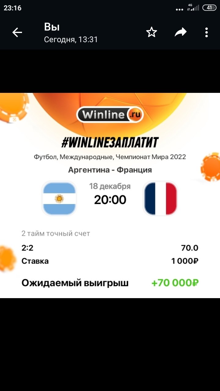 Здравствуйте помогите разобраться поставил ставку в винлайн на футбол Аргентина -Франция на точный счёт во тором тайме 2-2 ,точный счёт во втором тайме был 2-2 ,во время игры меня выкинуло из приложения букмекер попросил по новой авторизоваться потом получилось зайти но купоны со ставками исчезли потом выкинуло снова опять получилось зайти купоны появились ставка была на точный счёт коф.был 70.0 поставил 1000р выйгрыш 70000р, но букмекер пишет что что ставка не сыграла хотя точный счёт 2-2 во втором тайме и с таким же счётом закончилась игра в основное время ставка сыграла помогите вывести деньги которые выйграл