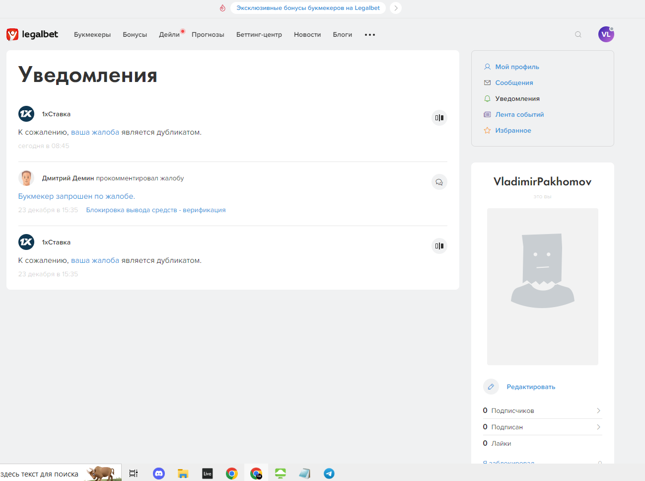 Здравствуйте, помогите решить проблему с бесконечной верификацией. Мой ID счёта 500784557 . Пополнил счёт на 100000 и выиграл 172000, после выигранной ставки захотел вывести деньги, но мне отказали и предложили пройти верификацию. также играю и баланс стал 233000 23 ноября отправил фото паспорта и прописки, 26 ноября отправил фото карты с двух сторон с которой пополнял счет, также 26 ноября отправлял фото выписки из банка, 2 декабря отправлял фото себя на фоне переписки с паспортом, 13 декабря отправлял фото квитанции ЖКХ, 16 декабря отправлял фото своего ИНН, 16 декабря отправлял ИНН, 19 декабря отправлял СНИЛС. Прошу Администрацию Арбитажа LEGALBET Помочь решить мою проблему. На ЦУПИСЕ у меня верификацированный аккаунт, все скриншоты переписок и баланса есть.