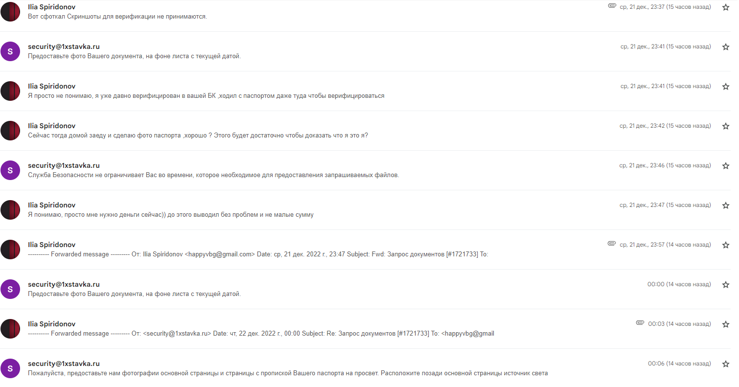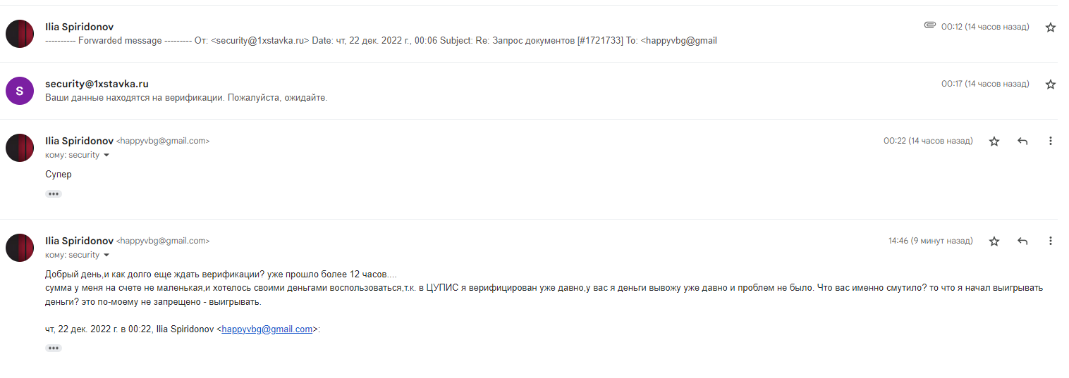 Добрый день,может вы поможете? выиграл крупную сумму в 1хставка,до этого тоже выигрывал и выводил без проблем около 270тысяч рублей, тут захотел вывести 471тысячу и мне не дали этого сделать,попросили написать в СБ, но я уже верифицирован в ЦУПИС ,лично приходил в контору 1хставка там давал паспорт для верификации данных и никаких проблем не было. Просто начитался на вашем сайте у людей с верификацией,и честно я был в шоке,что требуют фотаться на фоне переписки,потом требуют договор номера телефона на который привязан номер счета 1хставка,потом фото услуг ЖКХ... это какой-то бред и это может затянуться на долго. Вот мой номер игрового счета 432122447 Высылаю скрины переписок,и скрин счета с балансом! На данный момент,письмо пришло что Ваши данные находятся на верификации. Пожалуйста, ожидайте. Играю в данной конторе с мая месяца и первый раз столкнулся с данной проблемой как только сумма для вывода стала большой