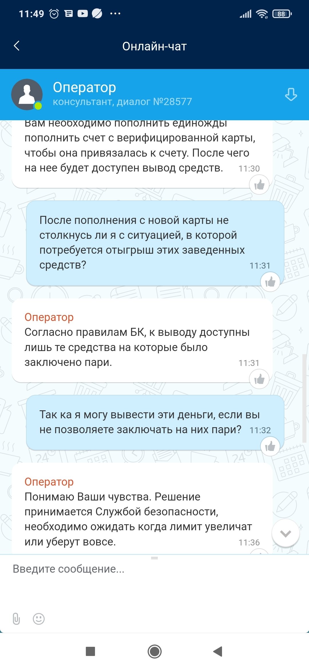 В общем, я прошел верификацию и завел деньги, 10000 рублей. Затем оказалось что я не могу ставить , ставка ограничена 0 рублей. Вывести деньги я тоже не могу, т.к. мне их надо отыграть. Я поговорил с поддержкой и те мне посоветовали подождать, пока служба безопасности решит мне увеличить лимит. Т.е. я завел 10000, и с них ни рубля поставить не могу, и не могу их вывести