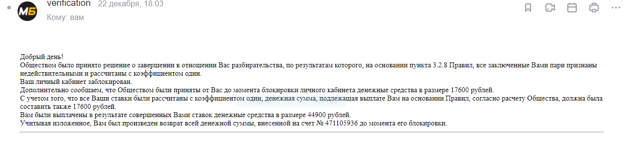 добрый день. букмекер мелбет заблокировал аккаунт и обнулил все ставки после всех верификаций. Может это какая-то ошибка сотрудника, но всё что просили присылал быстро, а так же прошел видео без единой ошибки, которое кстати пришлось выбивать из них 2 недели, тк бк явно затягивал время не желая платить. Видел по другим жалобам, что они просто пишут, что играл другой человек или еще в этом роде, так вот со мной это не пройдет, тк счет лично мой и играл только я и так же ответил на все 40 вопросов по нему, кроме ID, тк при блоке счета его посмотреть не реально. Прошу Легалбет помочь разобраться с этим беспределом от букмекера, который видимо обнуляет всех и вся для более успешного закрытия финансового года. если надо обратиться в суд, то я это сделаю, но намерен пойти до конца.