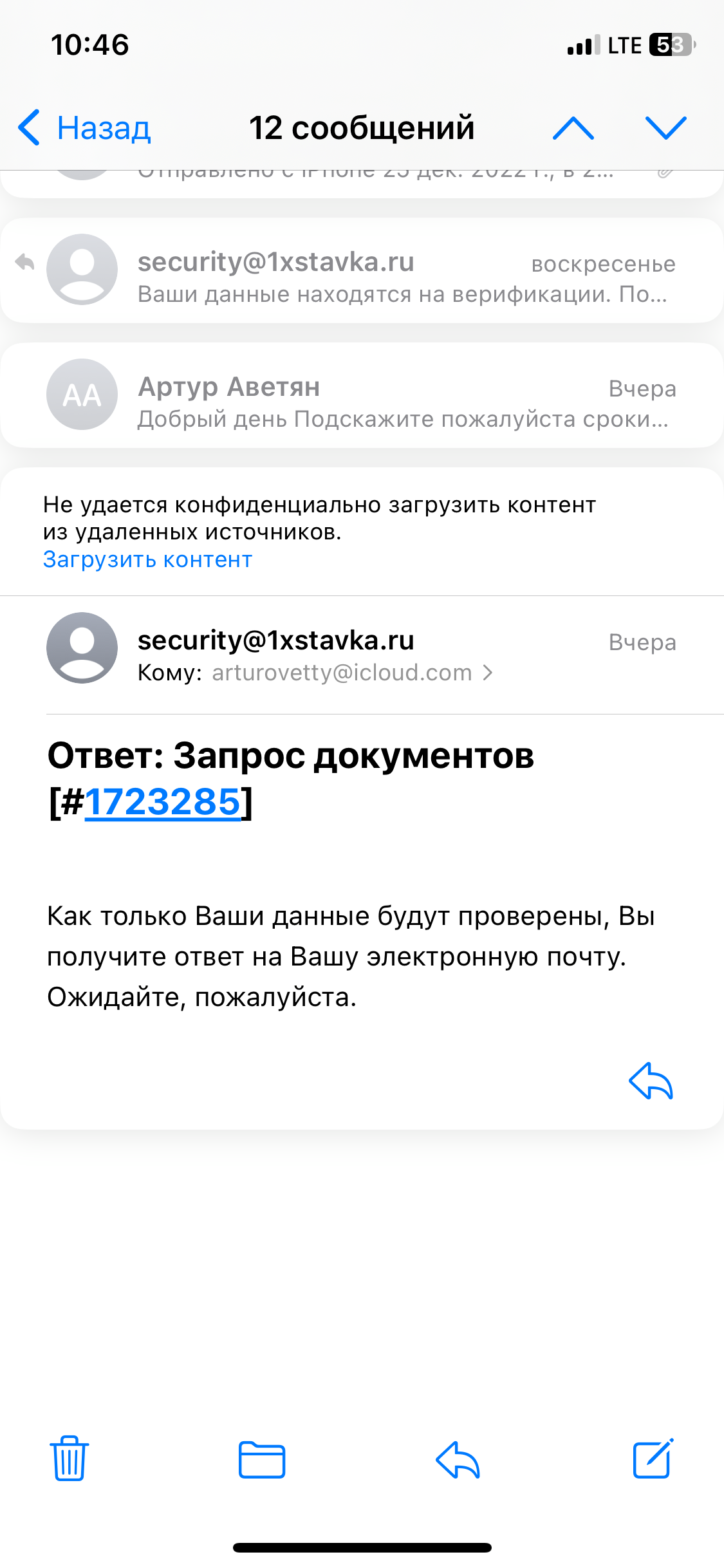 Играю в этой конторе с самого ее основания. Всегда был один аккаунт который верифицированный с самого начала, все выводы и пополнения с моих карт, киви кошелька и даже с баланса телефона. Никогда не было каких-то проблем. Суммы вывода за все время никогда не превышали 50к, как и пополнений. Ни разу не было ни одной проблемы. Тут ни с того ни с сяго - отказ. Затребовали документы паспорт с пропиской. Отправил. Проблема в том что почта конечно уже дачным давно забыта, отправил запрос на смену почты, запросили фотку с паспортом и текстом о смене почты. Отправил. Подскажите, есть ли шанс что мне выведут мой выигрыш (сумма смехотворная для них, 40к) или они надеятся что эти бесконечные запросы документов вынудят меня проиграть весь баланс?