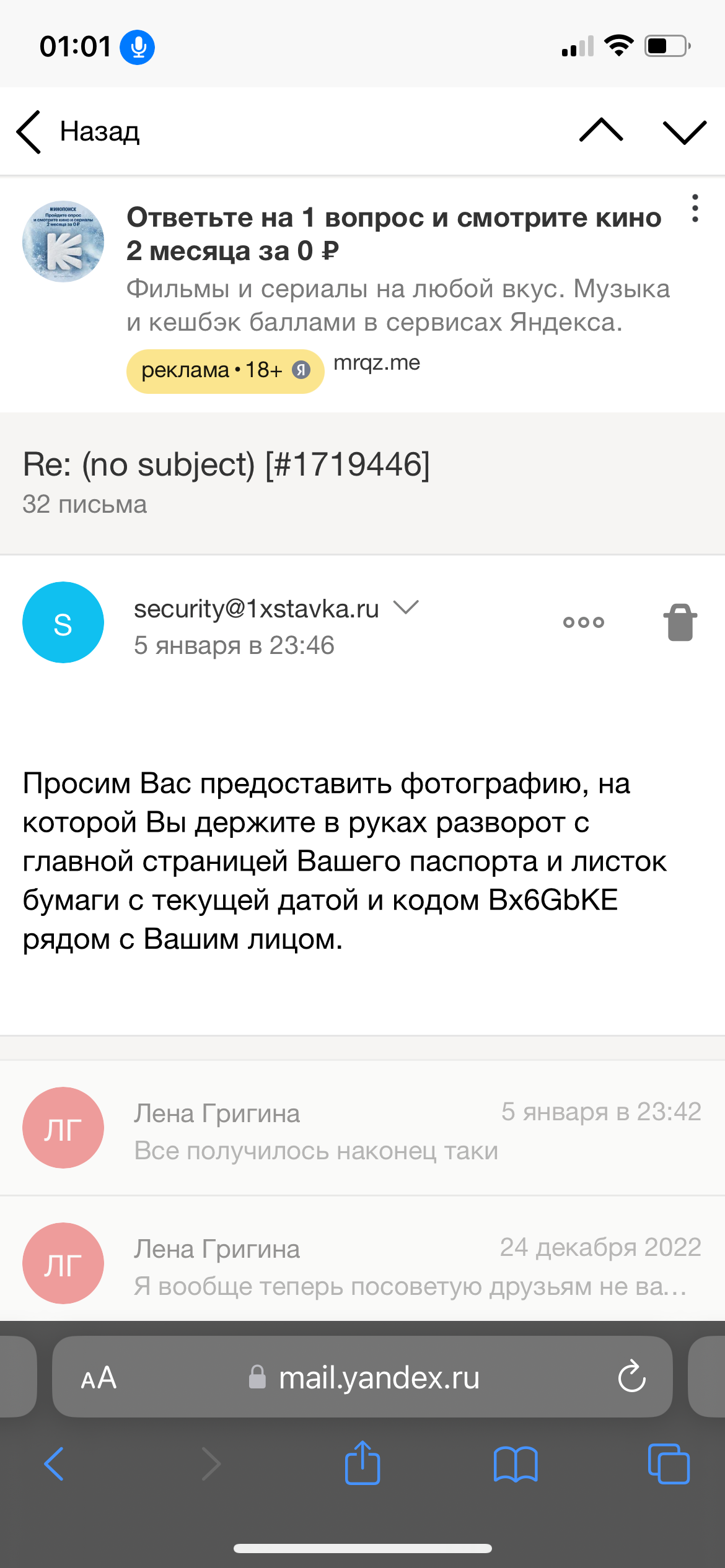 Я зарегестрировалась в 1х ставке, сделала полный цупис Успела поставить одну ставку Она зашла, как заблокировали вывод средств Началось с того что просили написать на почту Я написала и приложила фото паспорта и прописки, спустя 3 дня отвечают что нужна банковская карта точнее ее фото, я кстати пластиком не пользуюсь, у меня все карты виртуальные, они согласились и попросили выписку, что успешно я и сделала и отправила им Опять тишина 3 дня Просят фото с паспортом и перепиской на фоне Данное фото к сожалению по определенным обстоятельством сделать не могу Так как у меня один телефон и сломанный планшет. Мне нужно платить кредит, я уже просрочила дату платежа Мне как раз не хватает тех 7 тысяч рублей Пожалуйста посодействуйте в данном вопросе Мне сказали что их не волнует что нету второго девайса И фото должно быть Но я уже все им отправила что было в моих силах Помогите пожалуйста Фото переписки прилагаю