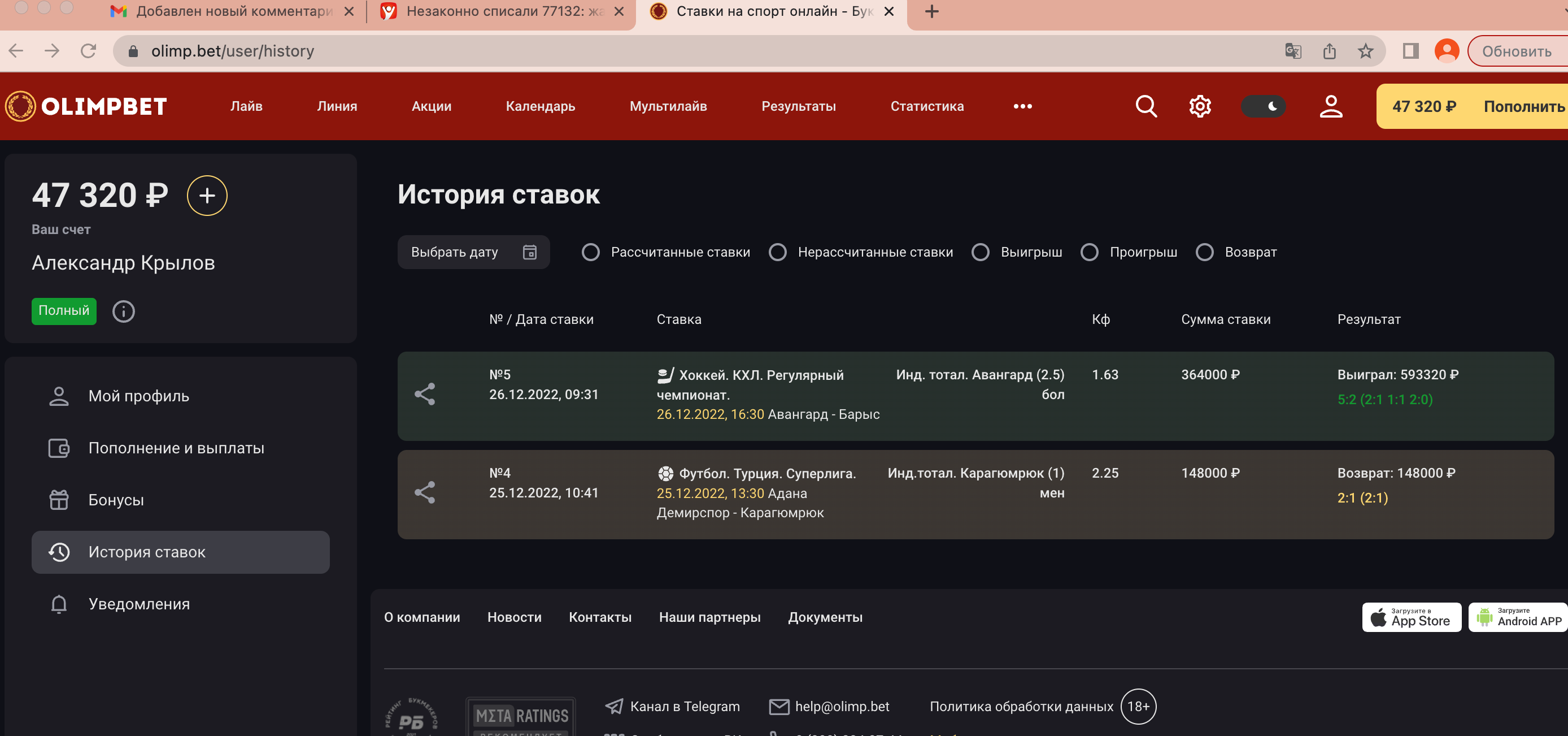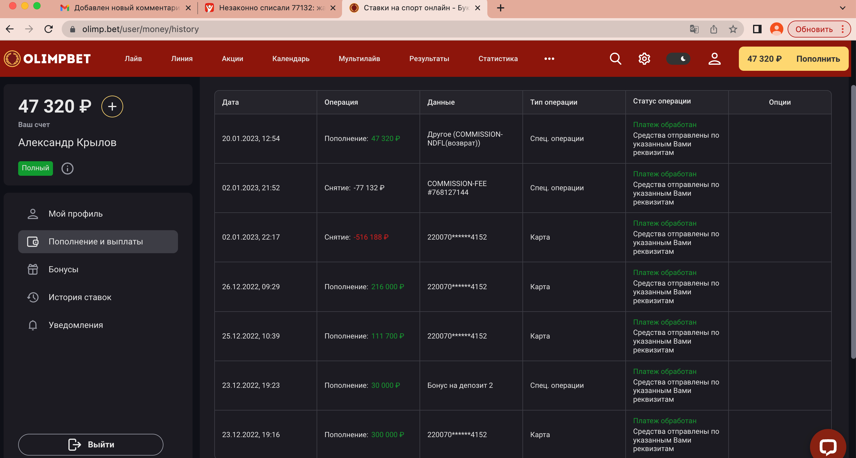 Зарегестрировался в БК Олимп пополнений было 3 штуки (300 000 - , 19:16, 111 700 - , 10:39 , 216 000 - , 09:29 . !!!ИТОГ: 627 700!!! Выводов средств не было.) Совершил ряд ставок ( а именно 5 штук, лишь последняя ставка оказалась выигрышной! Сумма на балансе на составила 593320 рублей! То есть я на проиграл в данной БК -34380 рублей, мой счет находится в минусе, дохода я не получил. я обратился за выигрышем - на что получил отказ в следствии верификации личности. Без проблем предоставил все фото. мне открыли вывод средств и о чудо, с меня по какой то причине списывается -77 132 рубля. В поддержке мне отвечают что это "Налог на выигрыш", но как мы все прекрасно знаем в соответсвии с НК ст. 217 налог взымается лишь с ДОХОДА ( ЧИСТОГО ВЫИГРЫША) а я ПРОИГРАЛ В ДАННОЙ КОНТОРЕ В СУММЕ 34380 рублей!!! Все скриншоты прикрепляю. Просьба повлиять на БК для компенсации МОИХ СРЕДСТВ в размере 77 132 рубля!