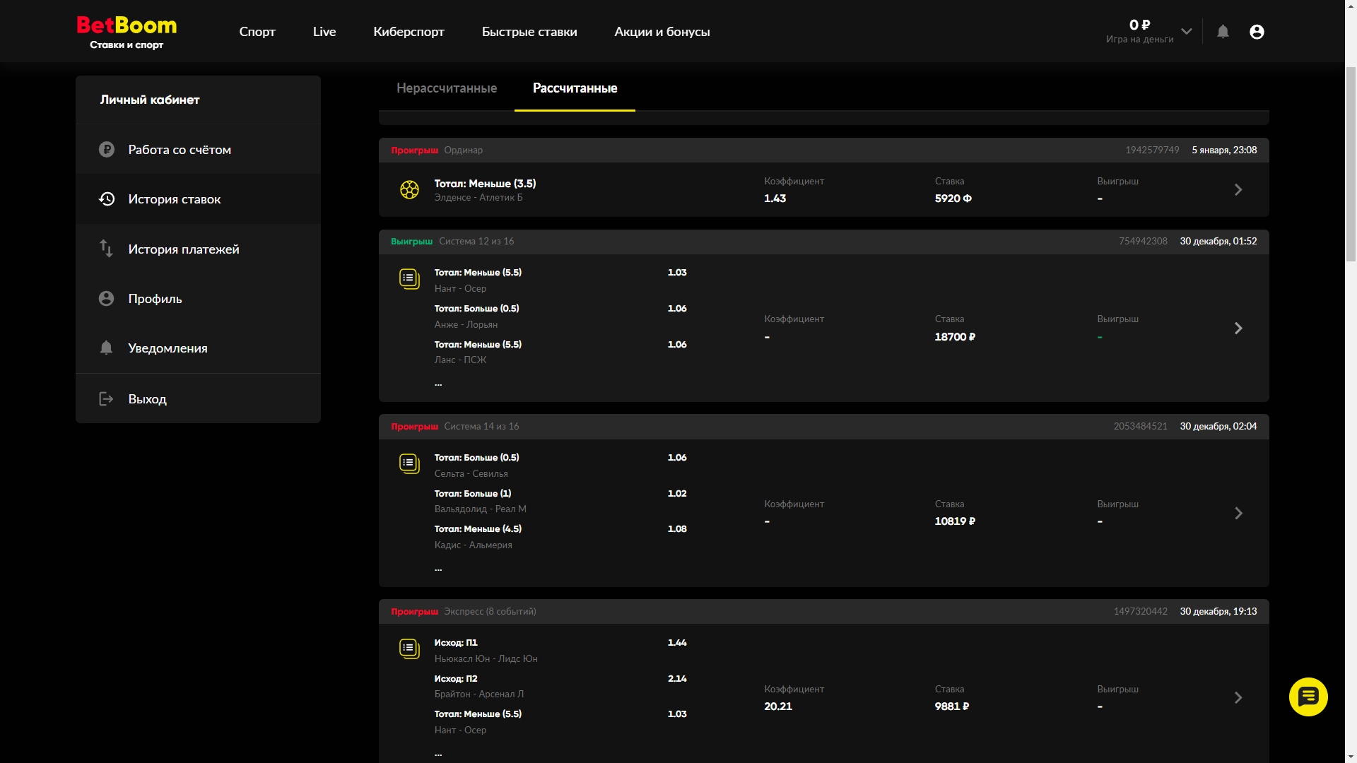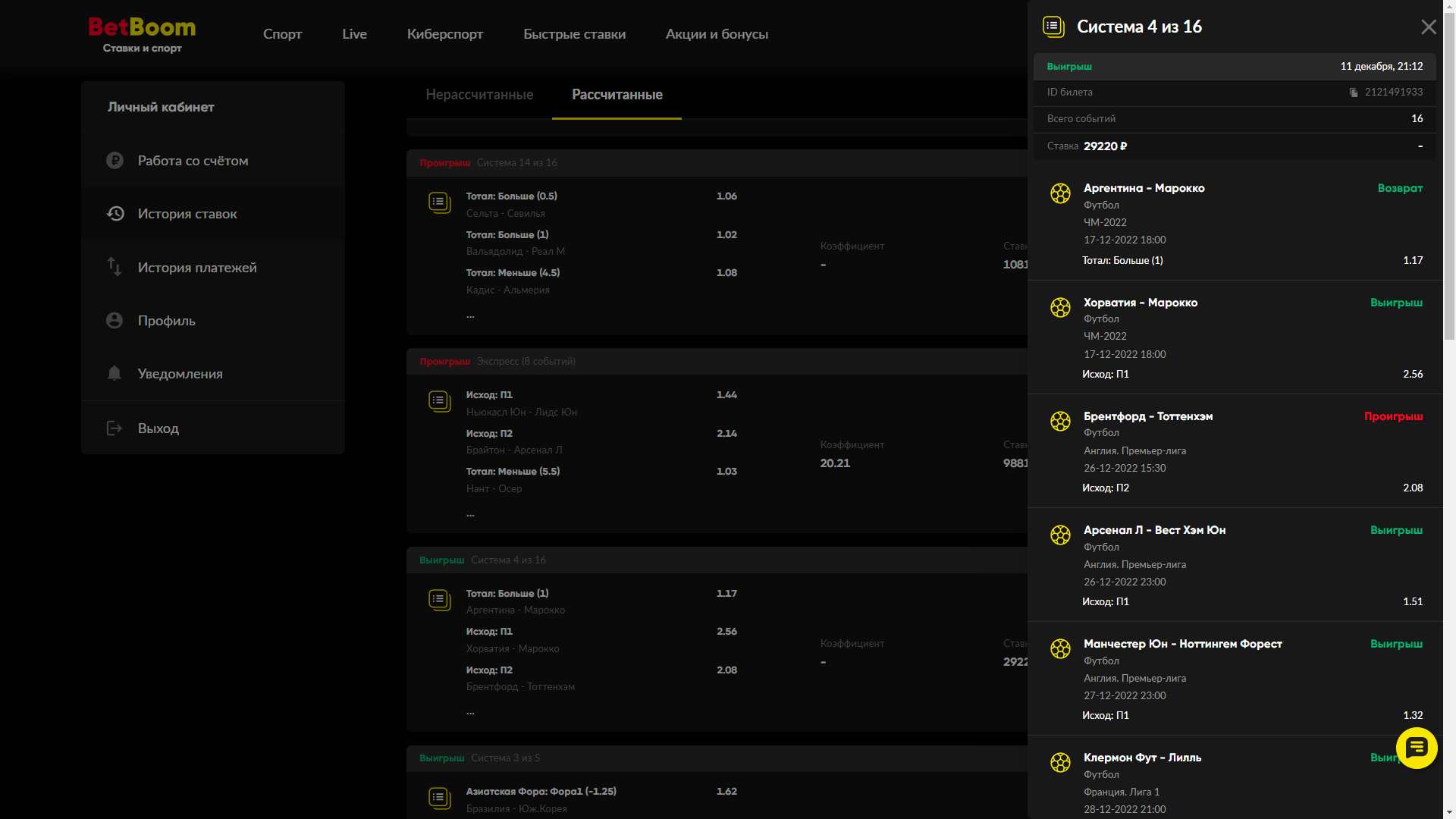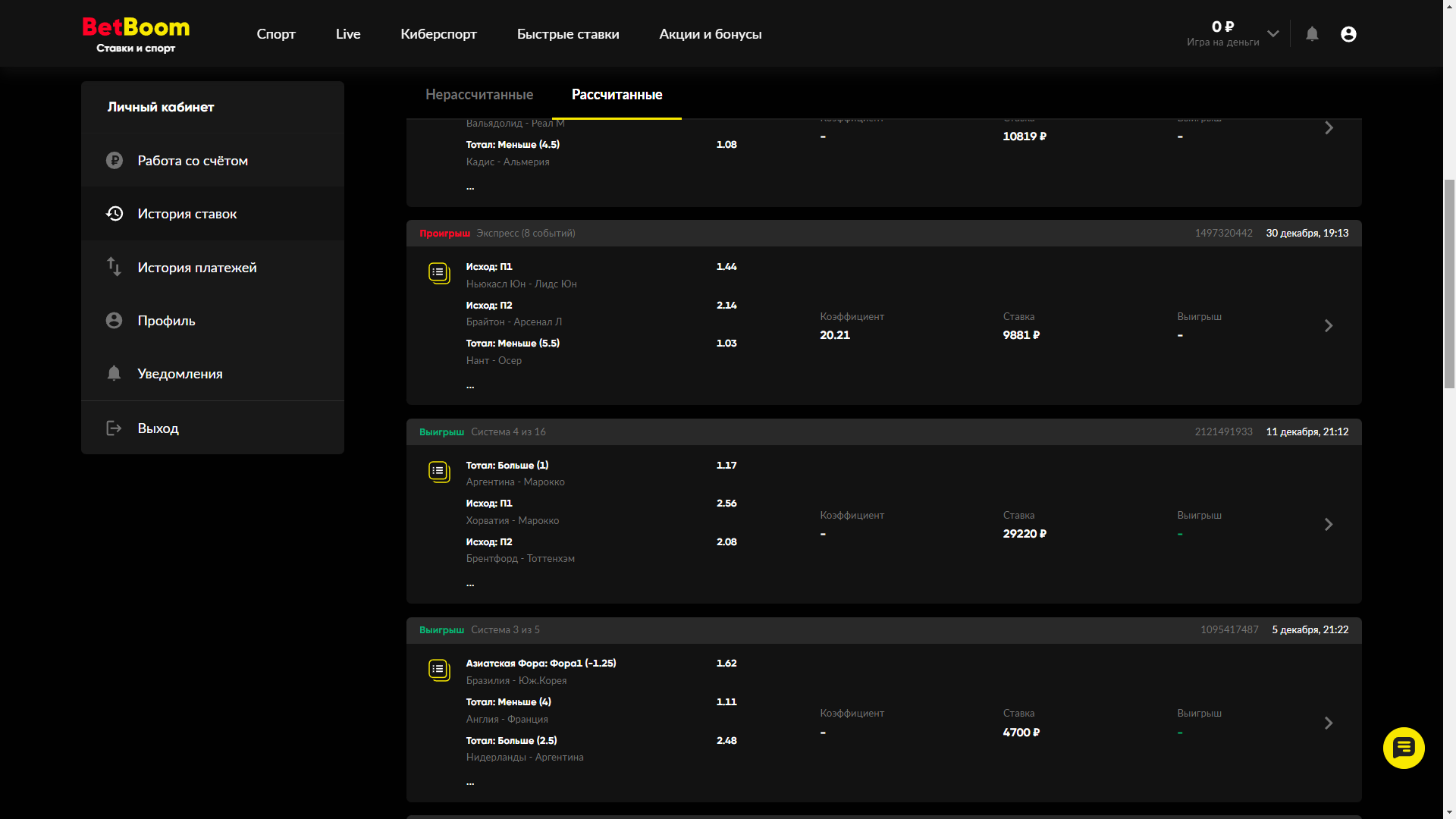 Здравствуйте. Мною было сделано несколько ставок на "систему" в нижеописанных букмекерских конторах. Ставки были сделаны в декабре во время ЧМ по футболу 29220, 18700 8963, 4700, 8963, 16055 рублей. Первая выиграла по системе с шансом 12 из 16!, равно как и последующие 3 из 6, 3 из 5 и т. д.! Но букмекер не только не выплатил выигрышей, но и не вернул даже поставленных сумм, хотя сам подтверждает о выигрыше ставок, поэтому на счете нет средств - 0. Букмекер Фонбет, БетБум.