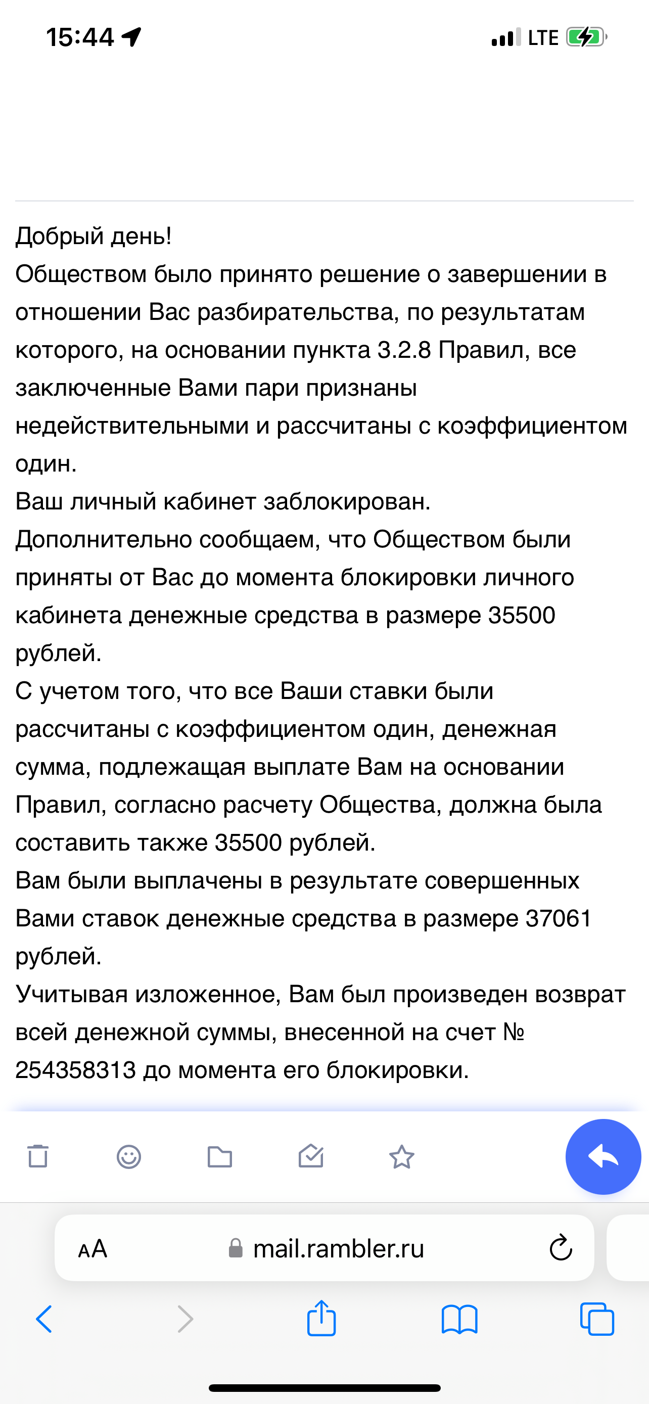 Здравствуйте. Делаю ставки в букмекерской конторе мелбет ,в один из дней захожу на аккаунт и у меня пишет client blocked. Сказали выслать все документы (выслал) ,назначили видеоверификацию (была успешно пройдена). Сегодня пришло письмо от них что все мои ставки будут рассчитаны с кф 1 ,и аккаунт мой заблокирован (ссылаются на пункт 3.2.8). Аккаунт мой !! Не дроп ,ни мультиаккаунт!! Мошенничество с их стороны в чистом виде !