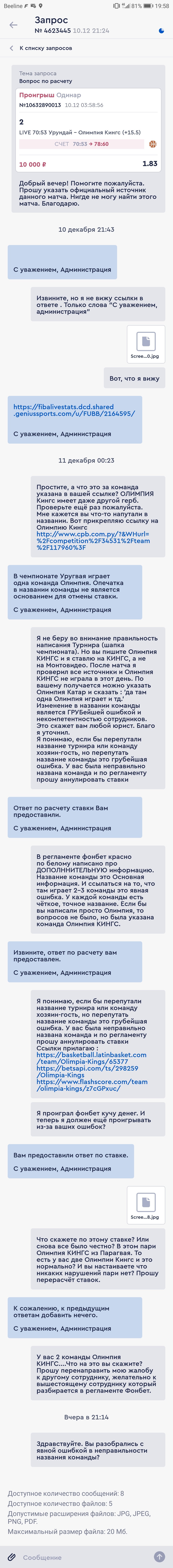 10 декабря я поставил 15 ставок типа одинар по 10000 руб каждая на баскетбольный матч указанный в БК Фонбет как Урундай – Олимпия КИНГС. Мои ставки проиграли. Скриншоты номеров ставок (от 10632591273 до 10632890013) прилагаю. Я усомнился в результате матча и запросил у БК Фонбет официальный сайт. Они мне его прислали. На сайте увидел, что герб команды Олимпия не совпадает с гербом команды Олимпия КИНГС. Я указал на это администрации БК Фонбет. На что получил ответ : «В Уругвае играет одна команда Олимпия. Опечатка в названии команды не является основанием для отмены ставки». Я не беру во внимание правильность написания Турнира (шапка чемпионата) . Но то, что вы пишите, что это Олимпия Кингс, и я ставлю на КИНГС, а не на МОНТОВИДЕО. После матча я проверил все источники и Олимпия Кингс не играла в этот день, оказывается. Можно Указать Олимпия Катар и сказать: да там одна Олимпия играет и тд. Опечатка в названии команды является ГРУБЕЙШЕЙ ошибкой и некомпетентностью сотрудников БК. Я понимаю перепутать названия турнира, хозяин-гость , но перепутать название команды - это грубейшая ошибка. вот вам еще ссылки на то,что у вас была названа команда неправильно и по регламенту прошу аннулировать мои ставки . Прикрепляю ссылки на Олимпию Кингс. В регламенте красно по белу пишется про ДОПОЛНИТЕЛЬНУЮ информацию. Названия команд - это ОСНОВНАЯ информация. И ссылаться на то,что там одна или две-3 команды играет - это явная ошибка. у Каждой команды есть четкое название. И если бы вы написали просто ОЛИМПИЯ , то не было бы вопросов. Но ВЫ четко указали, что это команда КИНГС. Также у меня есть ставка №10206794744 от 29 ноября 2022 года на матч чемпионата Парагвая по баскетболу между командами Депортиво Сан-Хосе – Олимпия Кингс (скриншот прилагается), где я брал победу Олимпии Кингс и проиграл. После моих аргументов администрация БК фонбет перестало отвечать на мои запросы и поменяла в моих купонах название команды Олимпия Кингс на Атлетико Олимпия. Прошу помочь мне в данной ситуации.