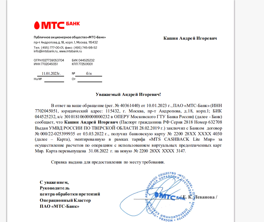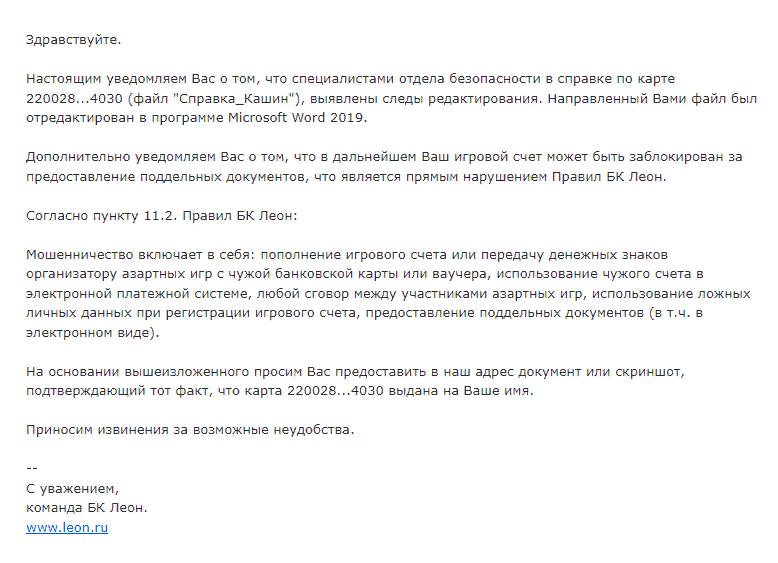 Запросили документы по 3 картам. В бумажном ввиде.Я сказал что могу предоставить в бумажном только одну карту.Другие 2 карты МТС Банка .Офиса в моем городе нету.МТС БАНК поддержка написала что предоставить документы по почте не может.Букмекер пошел на встречу.Подтвердил достоверность 2 карт.3 Карта была в мтс банке перевыпущена на другую,которую потвердили.И её теперь нельзя подтвердить выпиской ибо её нету.Можно только в офисе банка,которого нету в моем городе.И с нее не пополнялся счет БК уже больше 3 месяцев.Прошу помощи в этой проблеме.Что-бы дали вывести выигрыш на ту карту которую уже индефицировали .Все скриншоты имеются и общения с банком .