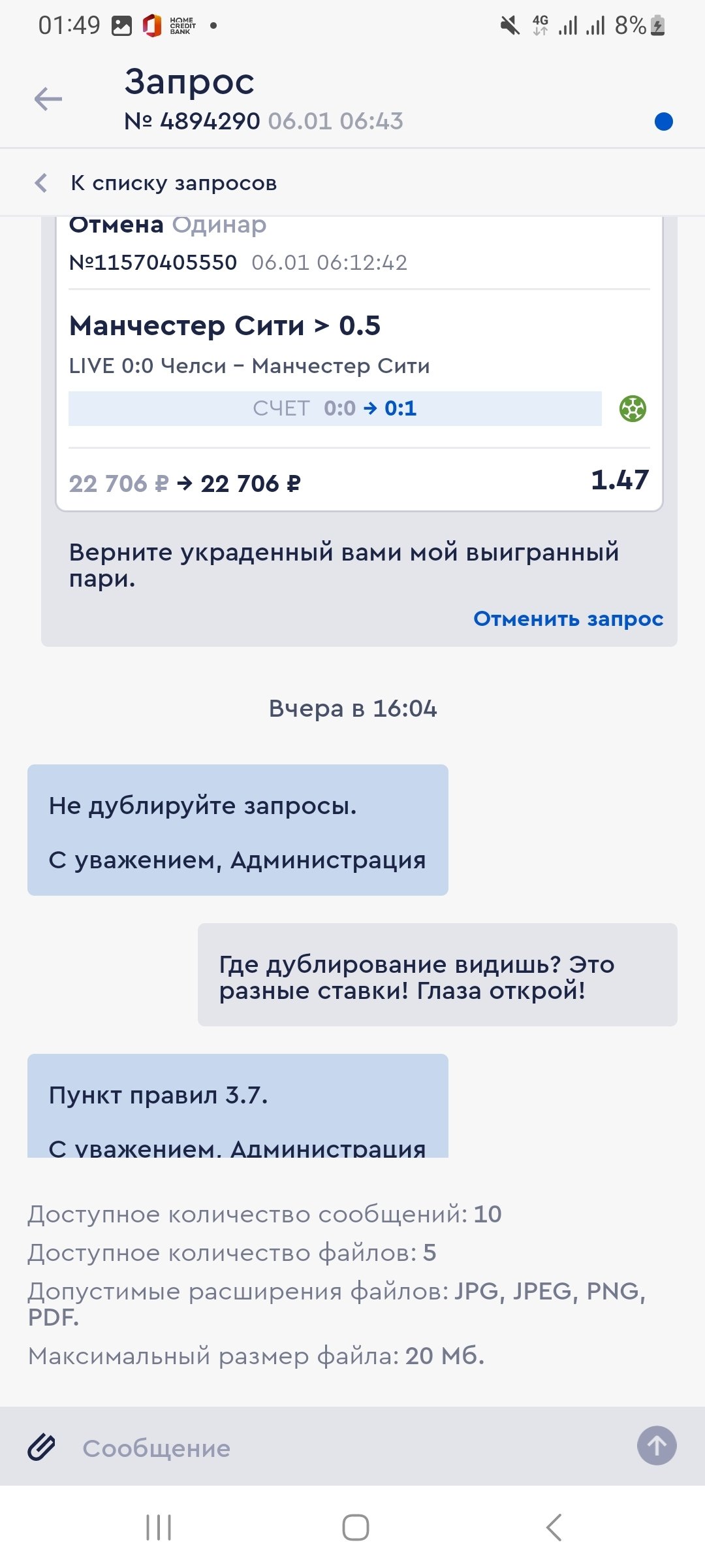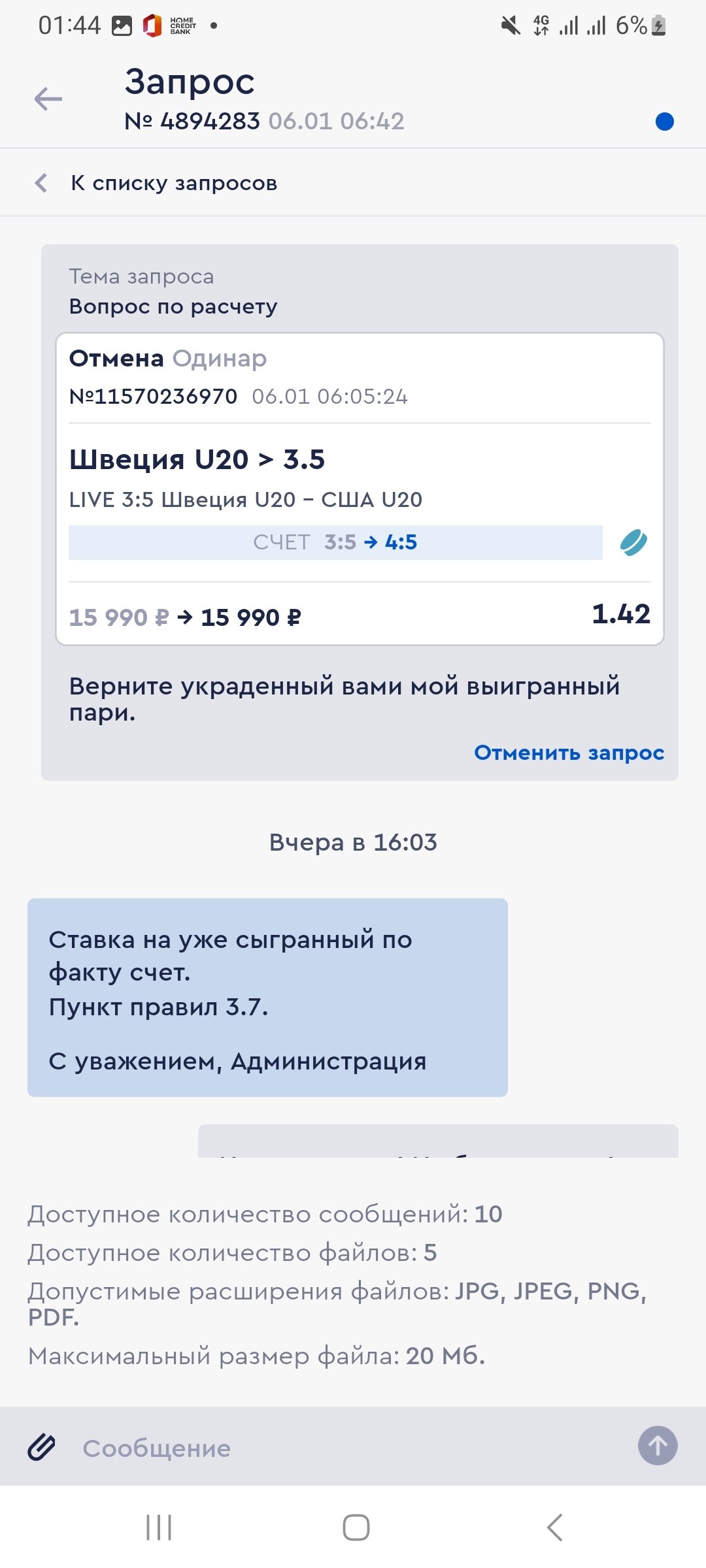 После 2-х выигранных пари, эти 2 пари отменили и заблокировали счет. При обращении в службу поддержки написали что проводится стандартная проверка и неправомерно запрашивали кучу фото моих документов. После получения моих документов долго молчали и на след.день написали что ставка была на уже сыгранный счет по первому пари, что является абсурдом. А второй пари был отменен автоматом из-за первого пари, хотя там были поставлены мои 15990 руб.не оспариваемых букмекером средств. Никак не доказали свои доводы. Ничего толком не обьясняют, высокомерят. Даже компенсацию не заплатили за незаконную долгую блокировку счета. Чем доказано что пари было на свершившееся событие? Они могут сказать что угодно. Это касается первого пари. А второе пари было отменено автоматом из-за отмены первого пари. На второе пари были поставлены мои не оспариваемые букмекером средства в размере 15990 руб., на них выигрыш должен быть расчитан, по аналогии п.4.6 Правил букмекера. Вина за ситуацию полностью на букмекере, какие-то технические моменты от клиента не зависят. И наглое обвинение клиента в своих технических моментах это элементы мошенничества чтобы отнять выигрыш клиента. Открытое ложное обвинение на п.3.7 Правил, не соответствующее их же пояснениям — это окрытое мошенничество(пари на свершившийся счет — это не п.3.7 Правил, на к-ое они ссылаются). Клиента можно обвинить во всем, чтобы отнять выигрыш! Это настоящие мошенники! Они намеренно долго отвечали более 6ч, обязаны были максимум за 3ч.отвечать, не соблюдали свой Регламент, чтобы нанести вред. Толком ничего не обьясняли, высокомерно демонстрируя свою безнаказанность. Клиенты для них «холопы», если они выигрывают, они начинают придумывать повод чтобы отнять деньги и это они открыто демонстрируют, вышли из СРО, их никто не контролирует, творят что хотят. Нарушены п.3.8, 4.4, Правил. И вообще интернет-задержка их системы это не «технический сбой» и не подходит под п.4.5.1 Правил, это качество связи. Если их система допустила на долю секунды ставку, значит это обычная работа системы, и Соглашение о выигрыше заключено публично, отмена не соответствует Гражданскому праву. Ложно обвиняя клиента по п.3.7 Правил, и не давая разьяснений, нарушая п.4.4 не предоставляя источник информации, блокировав на 2 дня счет, а потом из-за вредности блокировать все платежные системы оставляя только «банковский перевод» это мошенничество. Ввести ограничение по сумме выигрыша при любой ставке(одинар, экспресс) на максимум 1000 руб.это нарушение прав клиента. Опубликуйте все это. С этим букмекером не стоит иметь дело, вышли из СРО, почувствовали свою безнаказанность и творят что хотят, их никто не контролирует, они еще ложно ссылаются что их контролирует ЦУПИС, который занимается только платежами
