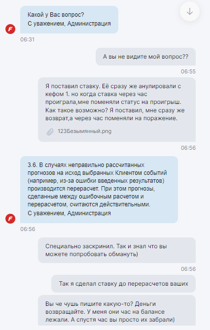Сделал ставку на dota2. Ставку сразу же аннулировали и вернули средства. Деньги лежали час на балансе. Вот Скриншот. Спустя час поменяли статус на проигрыш и забрали деньги. То есть мне аннулировали ставку сразу же. Деньги на счету лежат,я могу их ставить и выводить. А спустя час они тупо решили мою ставку снова возобновить по своей выгоде и забрать деньги. Абсурд...