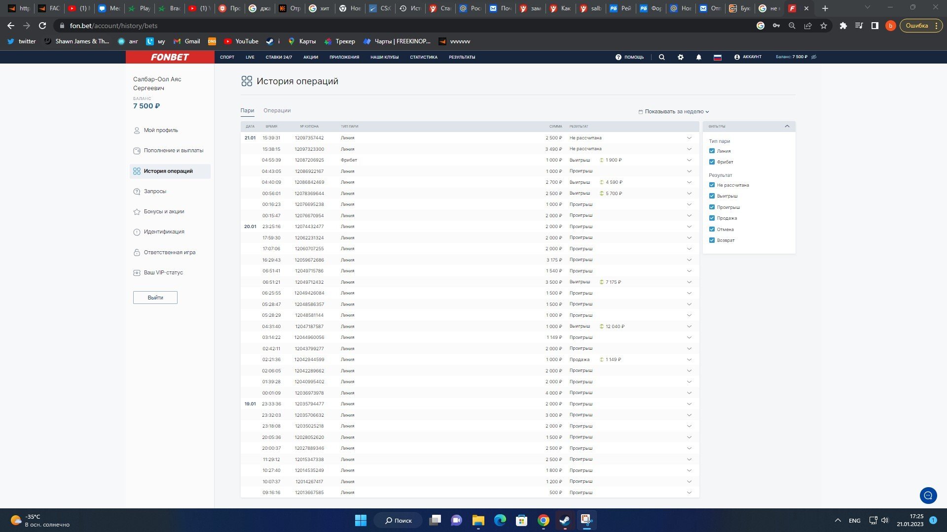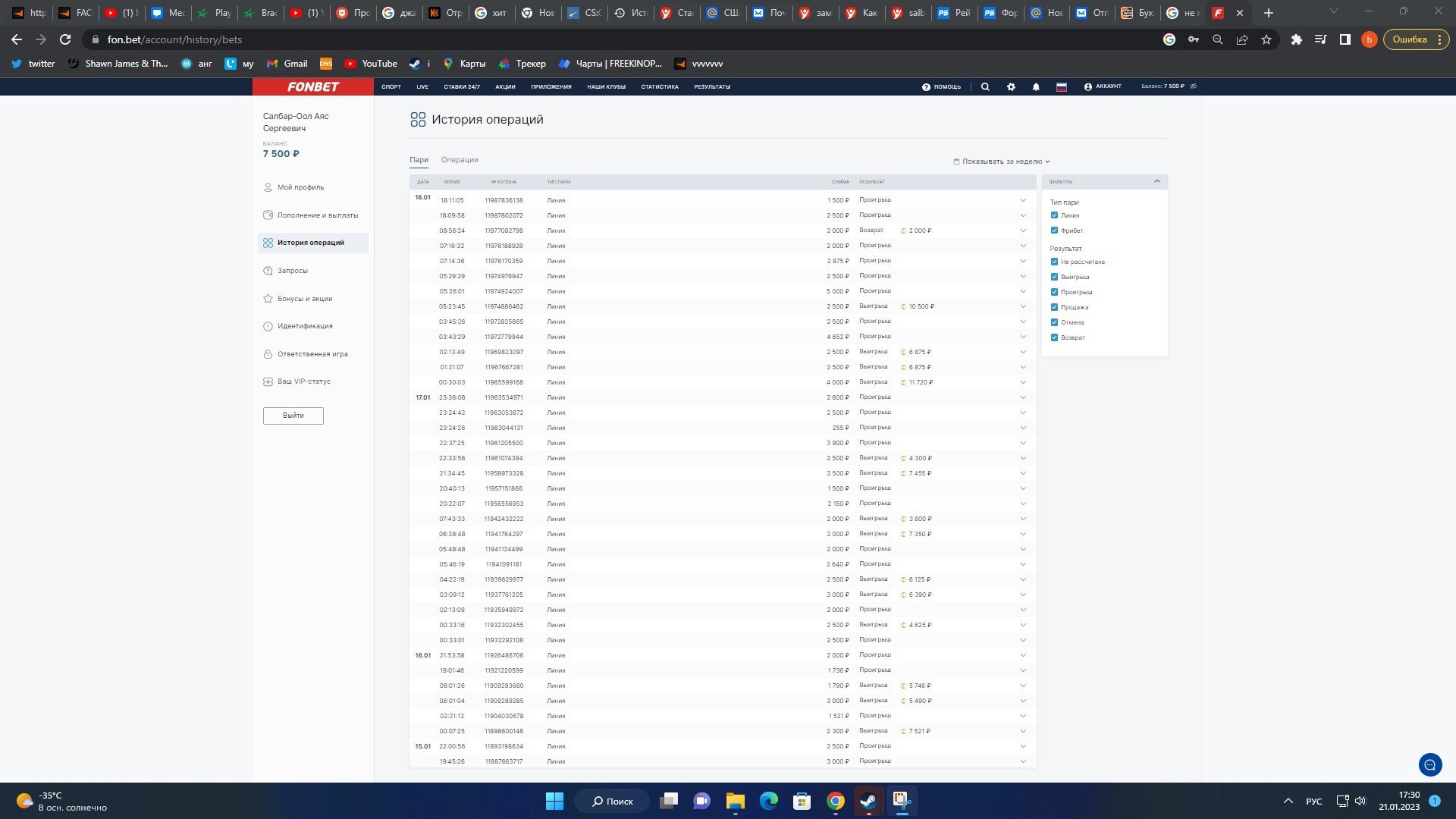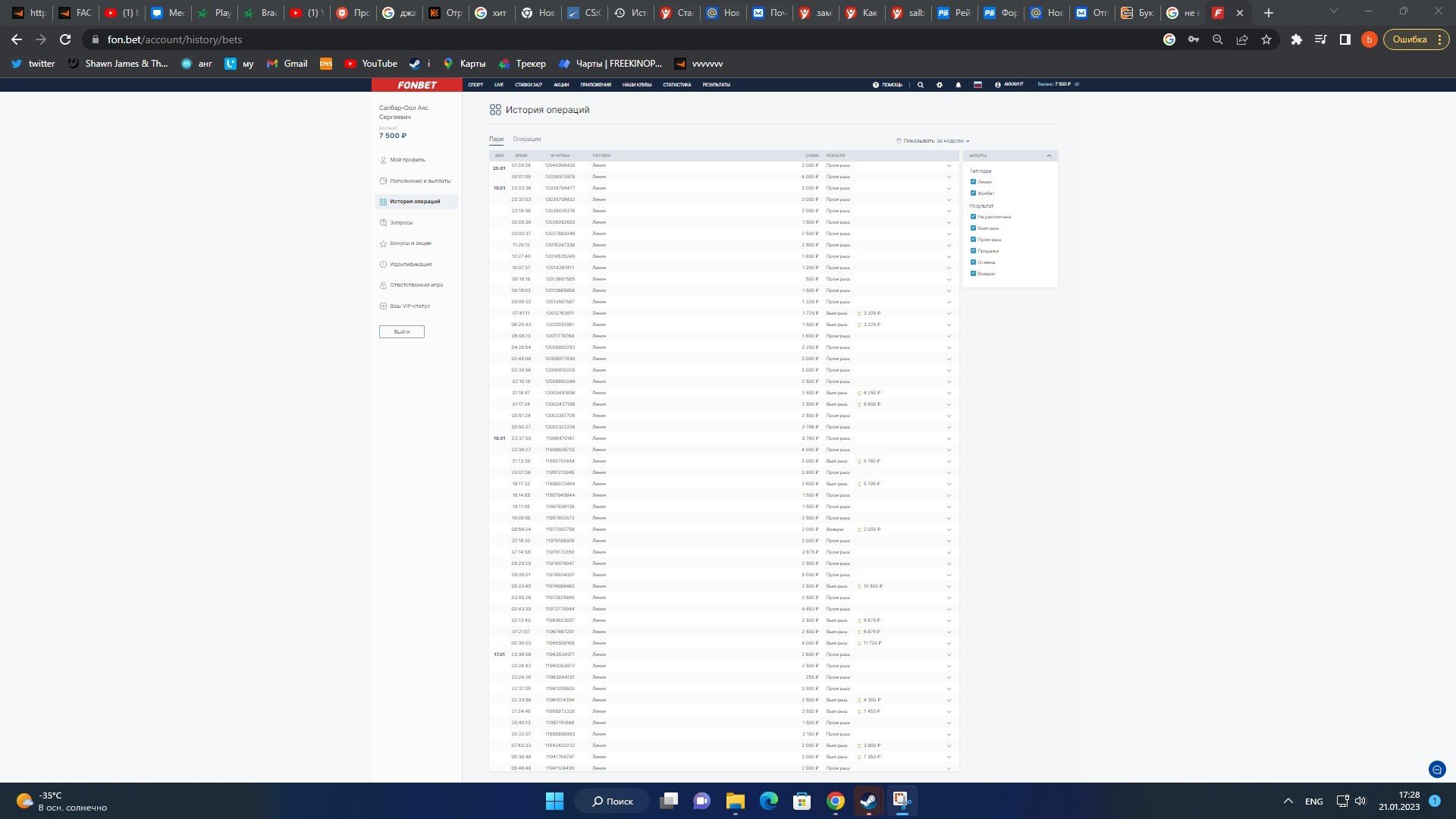 как вы можете видеть у меня до 21 01 2023 на фонбете в день почти по 20-30 ставок и вы видите что там разные суммы. у меня было так же и на винлайне до момента заморозки выигрыша