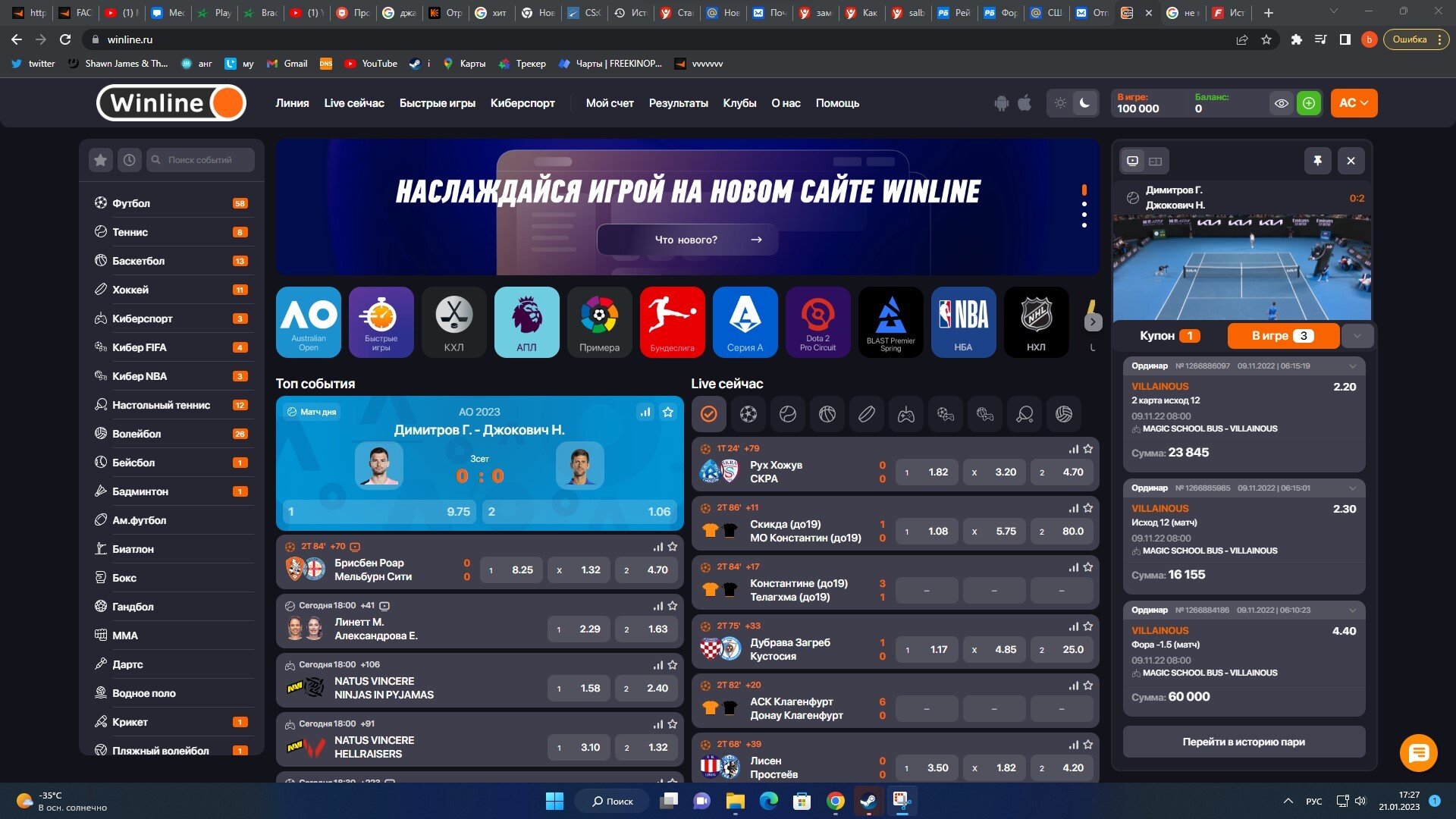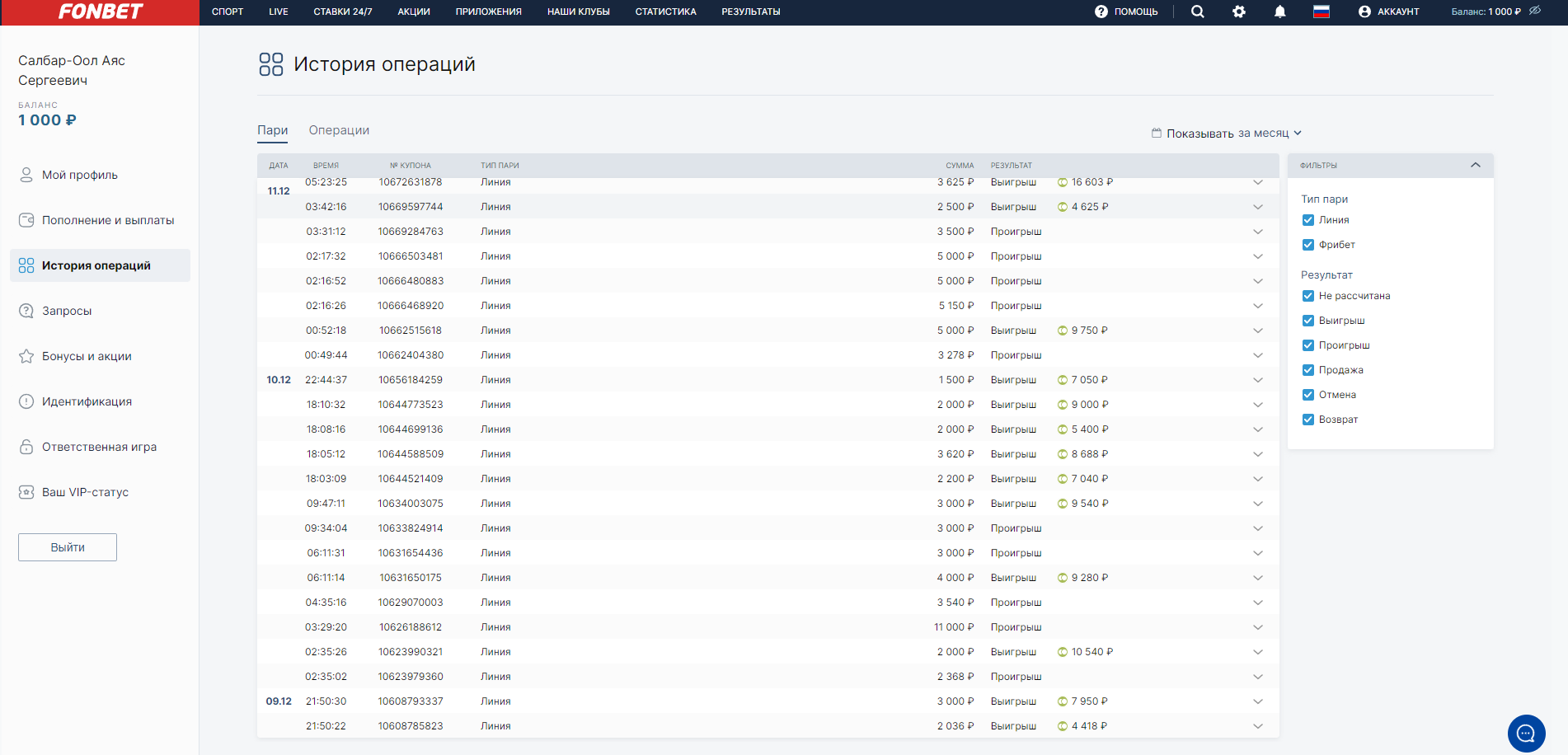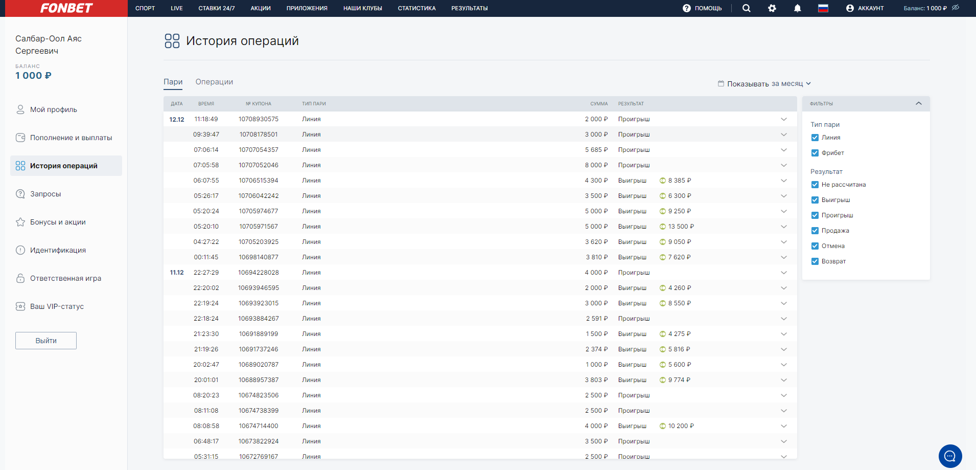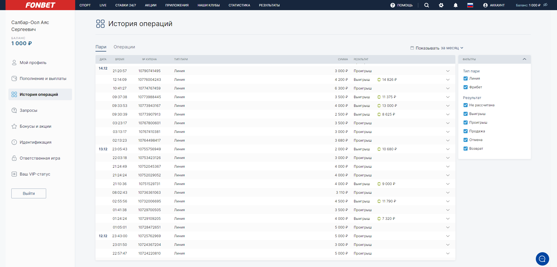 как вы можете видеть у меня до 21 01 2023 на фонбете в день почти по 20-30 ставок и вы видите что там разные суммы. у меня было так же и на винлайне до момента заморозки выигрыша