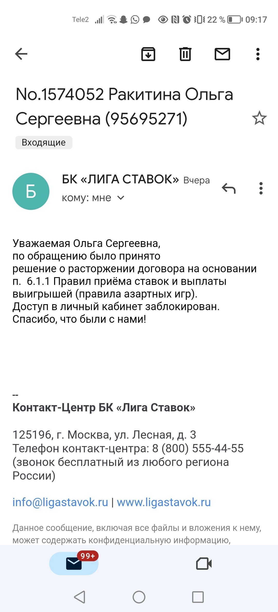 Здравствуйте, у меня какой-то крик души, ставила я ставки немалое количество времени, проиграла крупную сумму в лиге ставок, и тут мне посчастливилось выиграть нормальную сумму, так они мне обнулили баланс и заблокировали аккаунт, сказали ждать 31 день, не объяснив даже причину, уже прошло больше 3х недель, документы мои не запрашивают