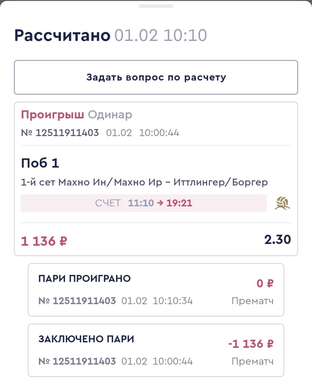 Пари 12511911403 было принято фактически при счете 12:11 вместо счета 11:10. После того как я это понял, т.к. изначально было написано, что пари принято не будет я обратился в поддержку(номер запроса 5143428) на что получил ответ мол все принято нормально, после этого мною были запрошены тайминги изменения счета, чтобы убедиться в честности ответа, которые мне не были предоставлены. Понимая что разбираться с таймингами мне придется самому и опираясь на ответ о том, что время начало матча указано в оффициальном источнике я нашел трансляцию матча и сравнив тайминги , понял что прав я, но контора вместо того, чтобы рассмотреть мою претензию решила отвечать по шаблону, что все принято верно, не сообщая данных, позже, при обращении к старшому сотруднику поддержки, для получения конечного ответа на мой вопрос мне была заблокирована возможность составлять запросы. Также прикрепляю скриншот согласно которому в данной ситуации оператор сказал что будет возврат.