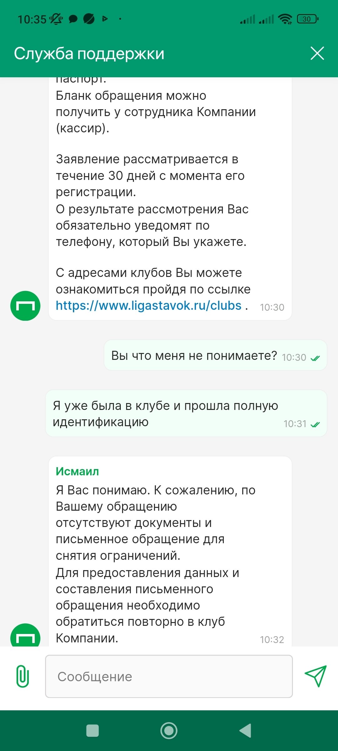 Здравствуйте. В лиге ставок начала играть где то три недели назад. Всё было хорошо, счёт пополняла и выводила. Я честно играю, сама. В один прекрасный день решила вывести некую сумму, но не смогла, вывод заблокировали, выдаёт ошибка,позвонить на горячую линию. На горячей линии мне сказали что в моём личном кабинете какие то ограничения, надо идти в клуб в моём городе и пройти полную идентификацию, и написать заявление на снятие ограничений. Я так и сделала. Сказали рассмотрение заявки от 3 до 30 дней. Пока прошло несколько дней, пока ответа никакого. Средства со своего счета так и не могу выводить, зато пополнять могу, странно всё это. Прочитав отзывы, решила Вам сразу написать, не ждать пока мне заблокируют или обнулят баланс. Я честно играла, считаю что действия конторы неправомерные. Очень прошу Вас разобраться с этой ситуацией.