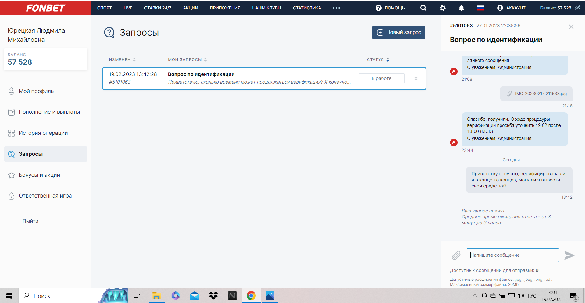 Верификация успешно завершена, вывод средств доступен. Проблема решена без участия Арбитража Легалбет.