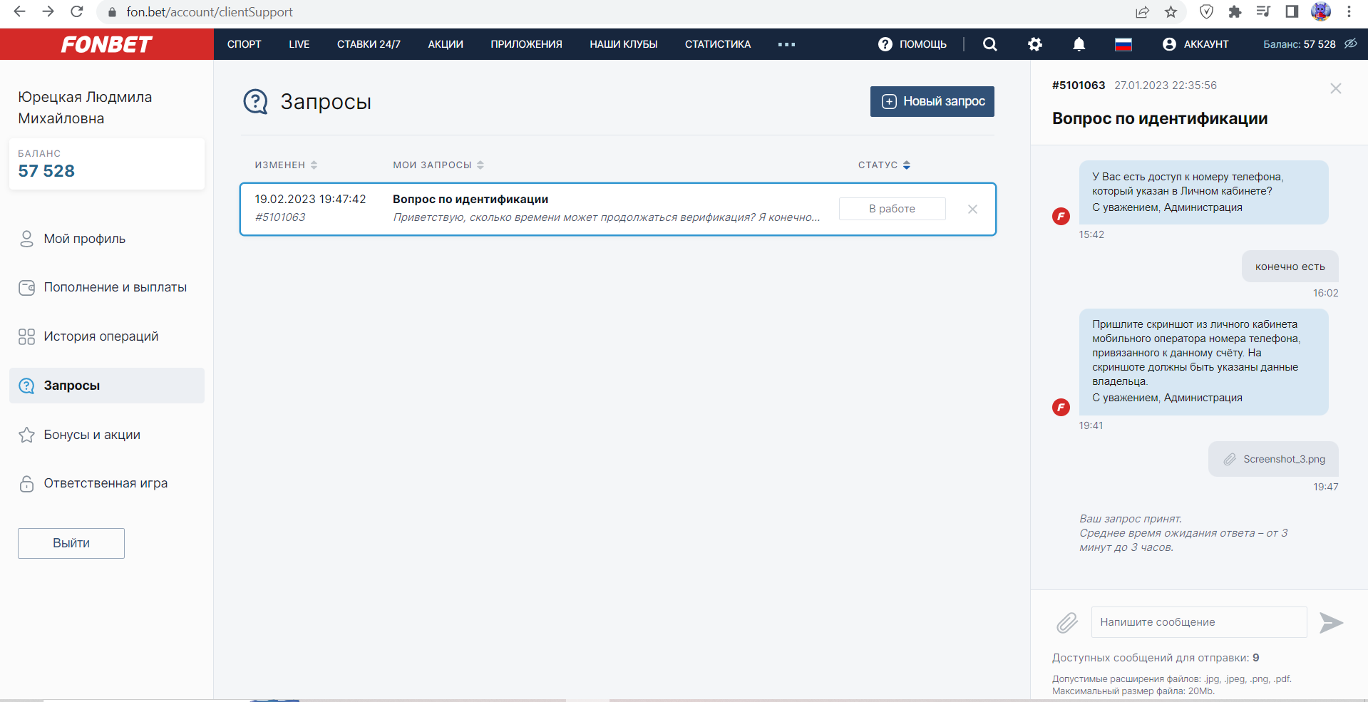Приветствую тех.поддержка Легалбет, мне уже надоели эти бесконечные отправления фотографий, я прошла видеоверификацию уже во ВТОРОЙ раз, а БК Фонбет, до сих пор выдумывает, что ставки совершаются не мной, ну это просто уже какой-то абсурд, прошу посодействовать выводу моих средств! Потому что это какое-то полное издевательство над своим клиентом!